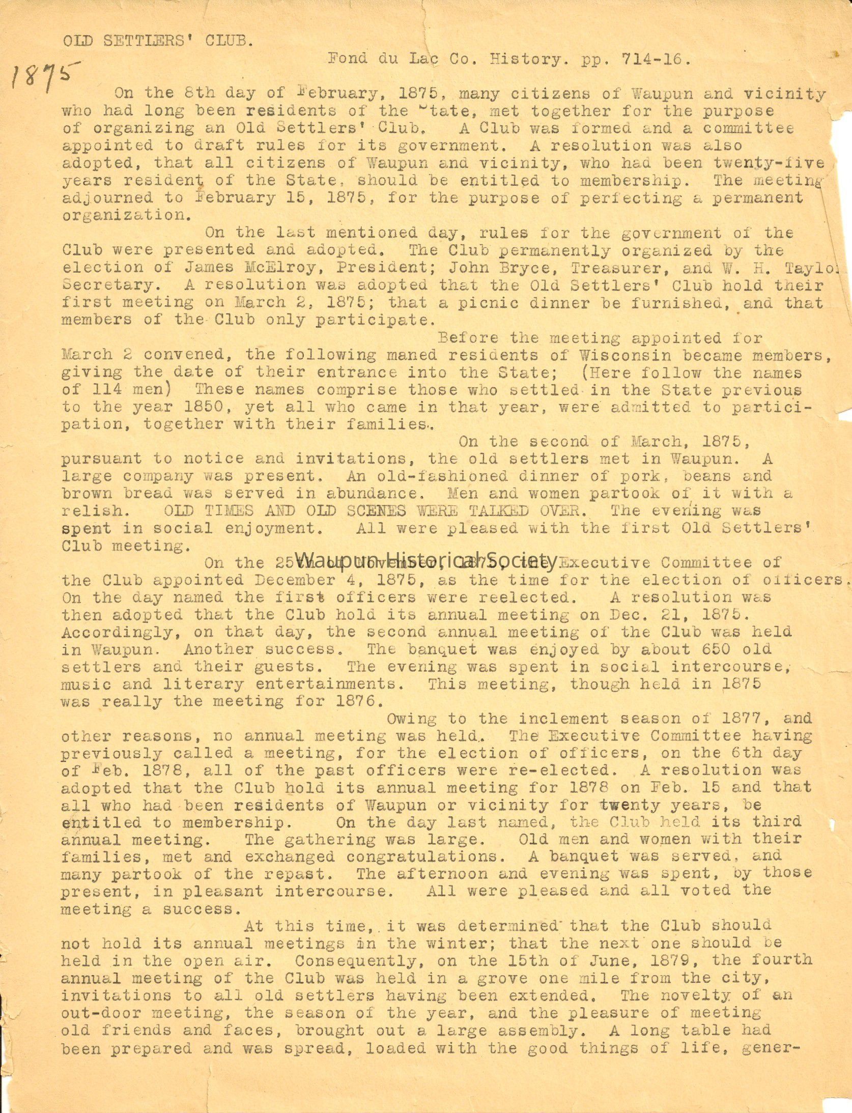 On the 8th day of February, 1875, many citizens of Waupun and vicinity who had long been residents of the state, met together for the purpose of organizing an Old Settlers' Club. A Club was formed and a committee appointed to draft rules for its government. A resolution was also adopted, that all citizens of Waupun and vicinity, who had been twenty-five years residents of the State, should be entitled to membership. The meeting adjourned to February 15, 1875, for the purpose of perfecting a permanent organization.
