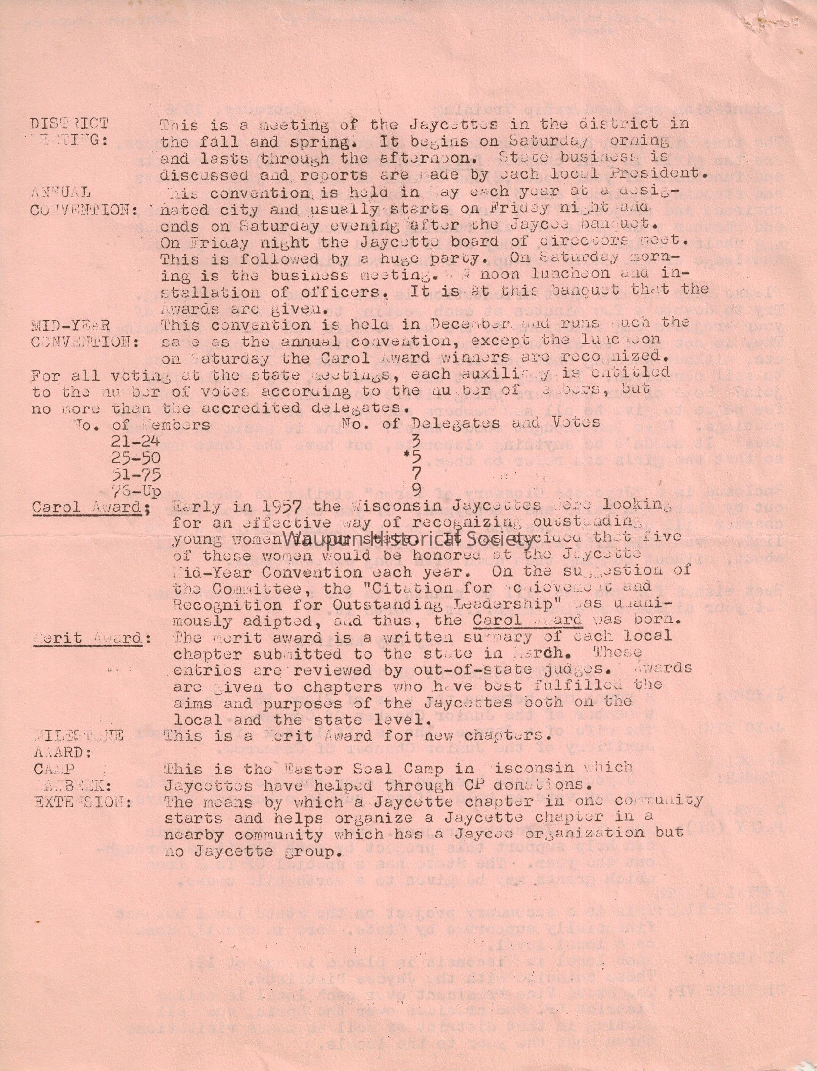 Carol Award: Early in 1957 the Wisconsin Jaycettes were looking for an effective way of recognizing outstanding young women in our state. It was decided that five of these women would be honored at the Jaycette Mid -Year Convention each year. On the suggestion of the Committee, the "Citation for Achievement and Recognition for Outstanding Leadership" was unanimously adipted (adopted), and thus, the Carol Award was born.