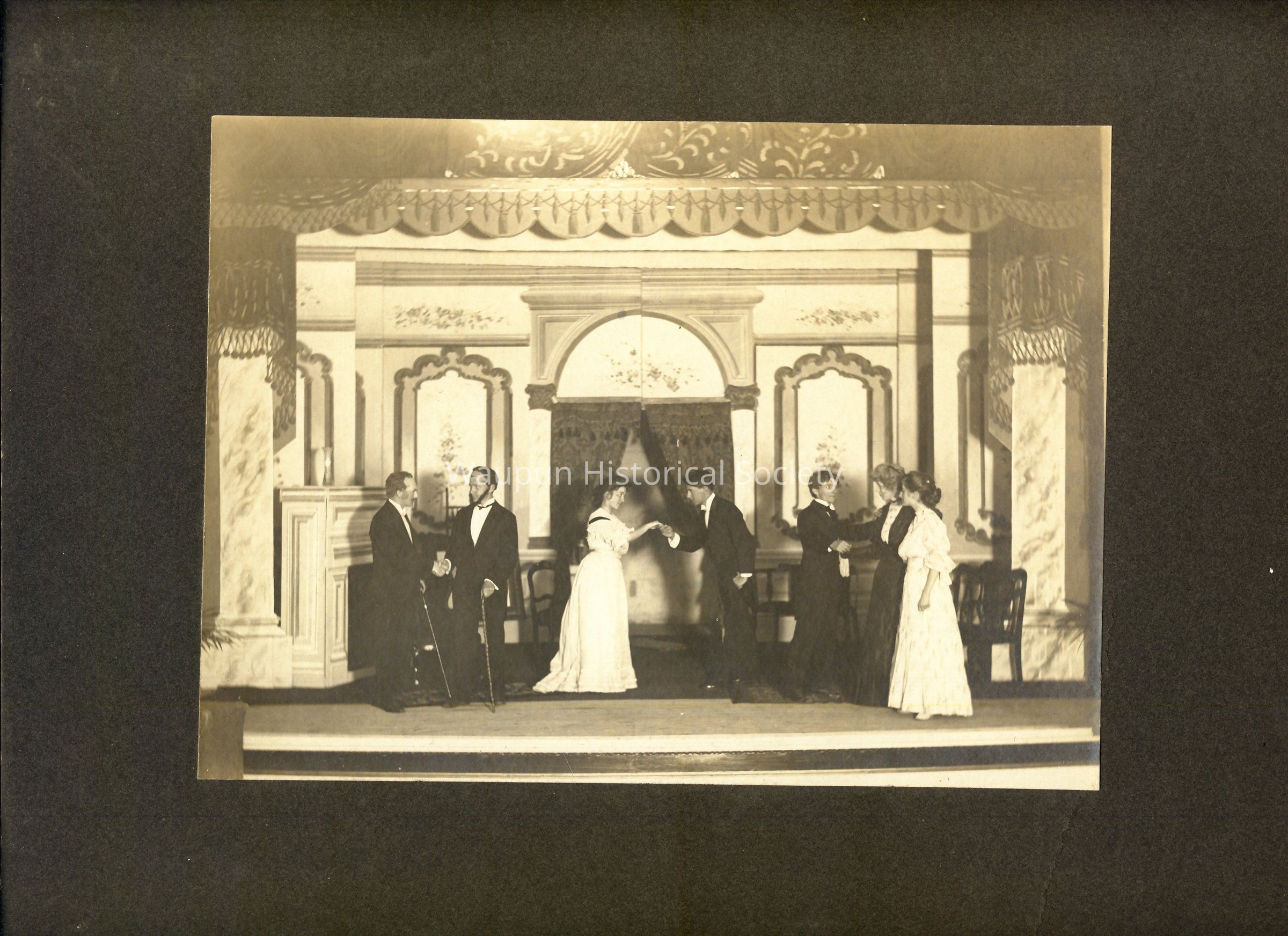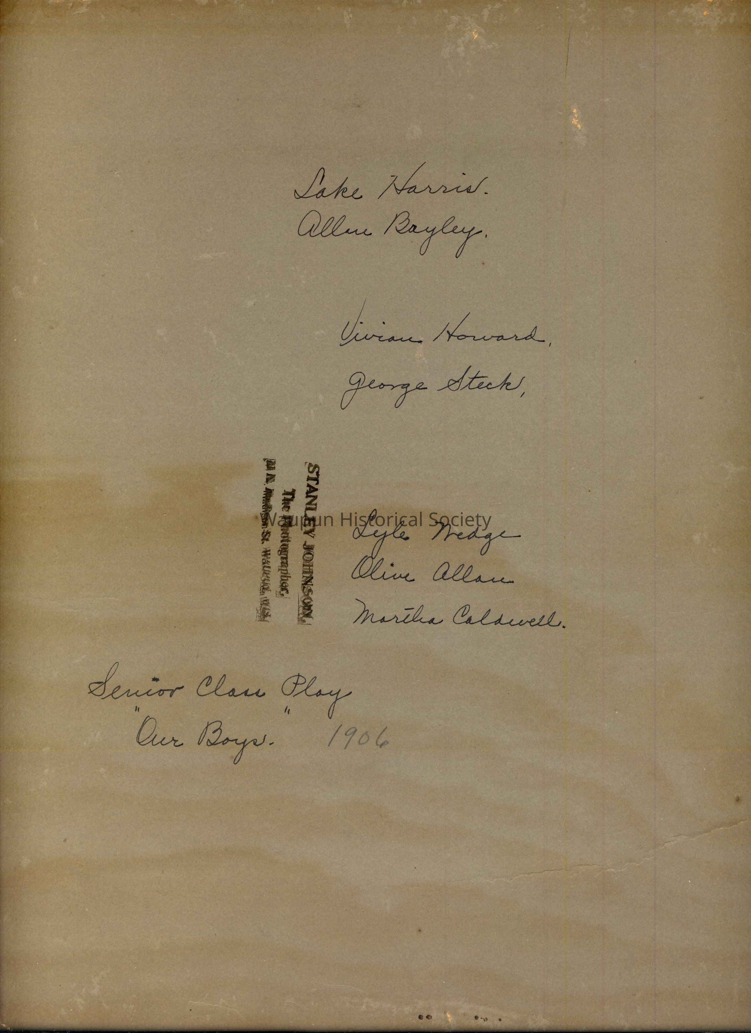 Black and white photo of Senior Class Play of 1906, "Our Boys". The photo is glued on a hard cardboard backing. Names of people that appear in the photo are listed on the back; they are as follows: Lake Harris, Allen Bayley, Vivian Howard, George Steck, Lyle Wedge, Olive Allan, Martha Caldwell.