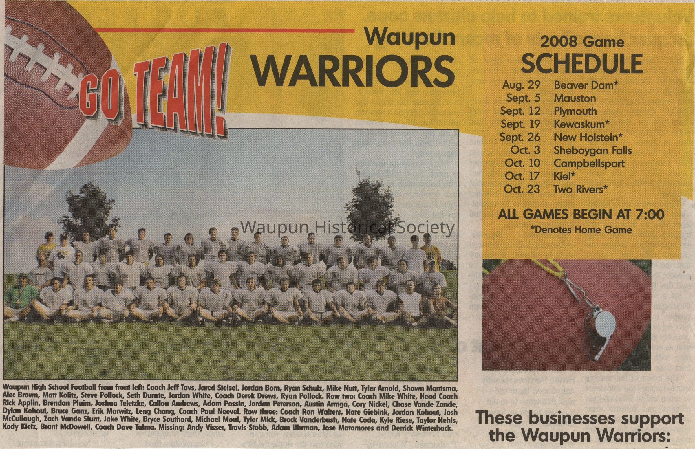 Waupun High School Football from front left: Coach Jeff Tavs, Jared Stelsel, Jordan Born, Ryan Schulz, Mike Nutt, Tyler Arnold, Shawn Montsma, Alec Brown, Matt Kolitz, Steve Pollock, Seth Dunrte, Jordan White, Coach Derek Drews, Ryan Pollock. Row two: Coach Mike White, Head Coach Rick Applin, Brendan Pluim, Joshua Teletzke, Callon Andrews, Adam Possin, Jordan Peterson, Austin Amiga, Cory Nickel, Chase Vande Zande, Dylan Kohout, Bruce Ganz, Erik Marwitz, Leng Chang, Coach Paul Neevel. Row three: Coach Ron Walters, Nate Giebink, Jordan Kohout, Josh McCullough, Zach Vande Slunt, Jake White, Bryce Southard, Michael Mout, Tyler Mick, Brock Vanderbush, Nate Coda, Kyle Riese, Taylor Nehls, Kody Getz, Brant McDowell, Coach Dave Talmo. Missing: Andy Visser, Travis Stobb, Adam Uhrman, Jose Matamores and Derrick Winterhack.Acquisition