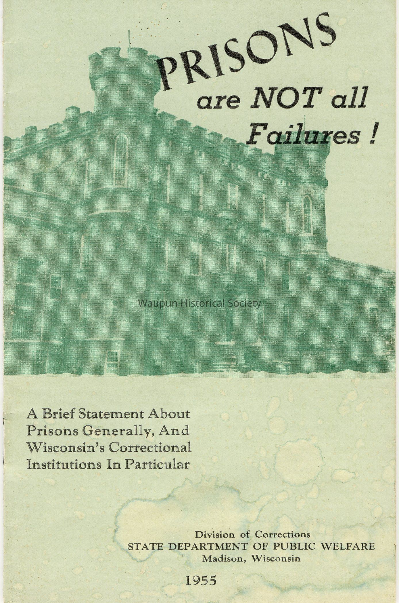 Prisons are NOT all failures. A brief statement about prisons, generally, and Wisconsin Correctional Institutions in particular. Published in 1955 by the Division of Corrections, State Department of Public Welfare, Madison, WI.
