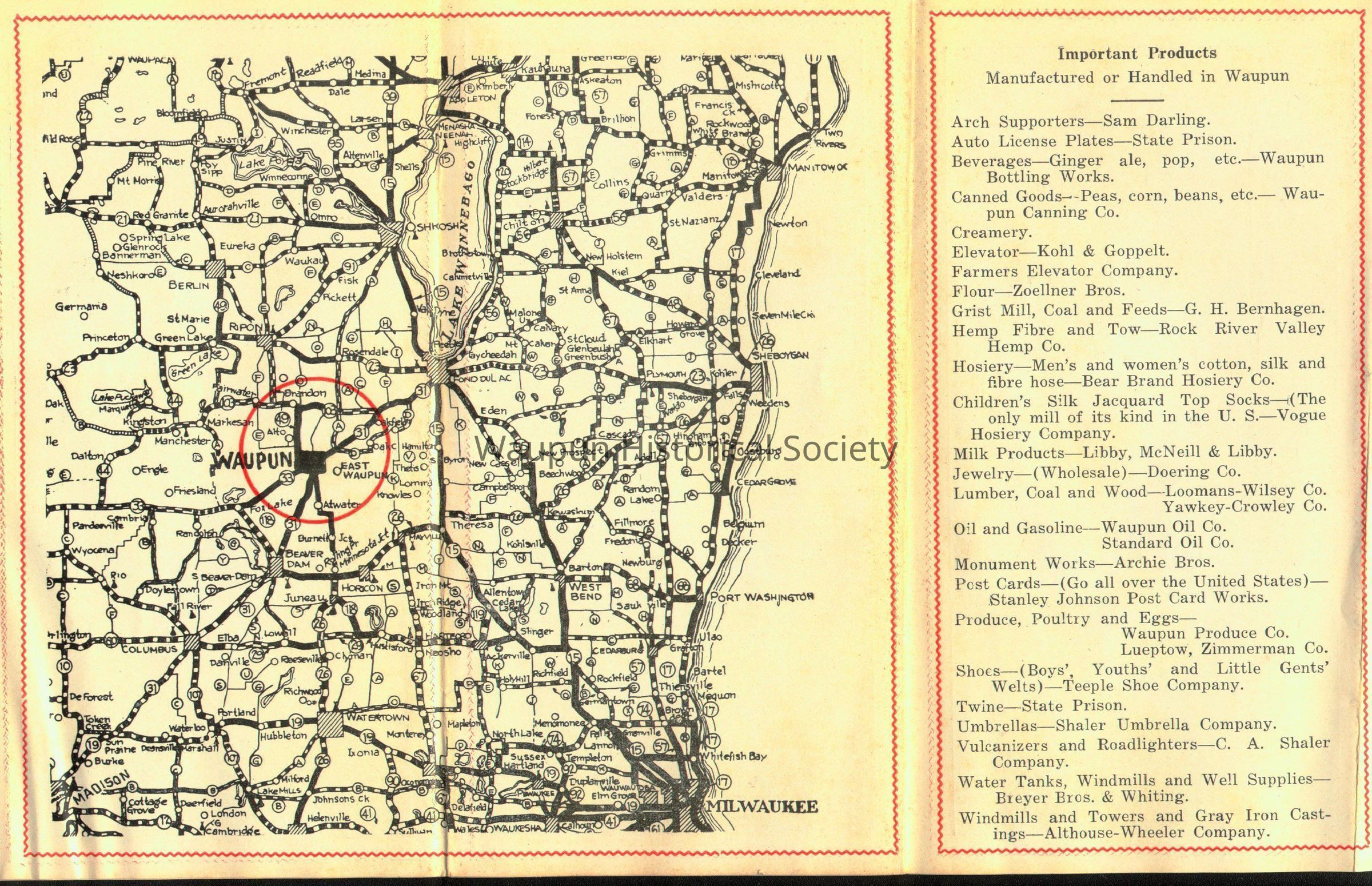 An advertising booklet prepared by the Waupun Chamber of Commerce. It lists a great deal of information about State Institutions, Transportation Facilities, Manufacturing, Municipal, Educational and Social, Agricultural, and Important Products. It also includes 23 pictures of Waupun. Date of publication is unkown but probably about the 1920s.Acquisition