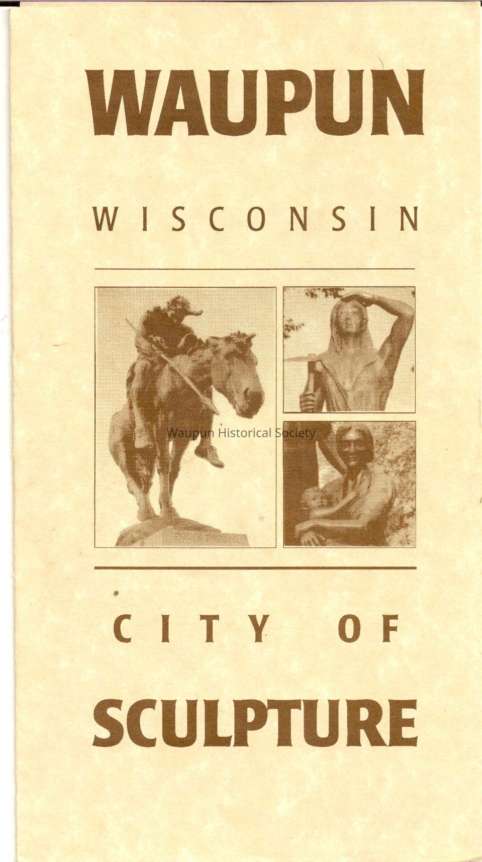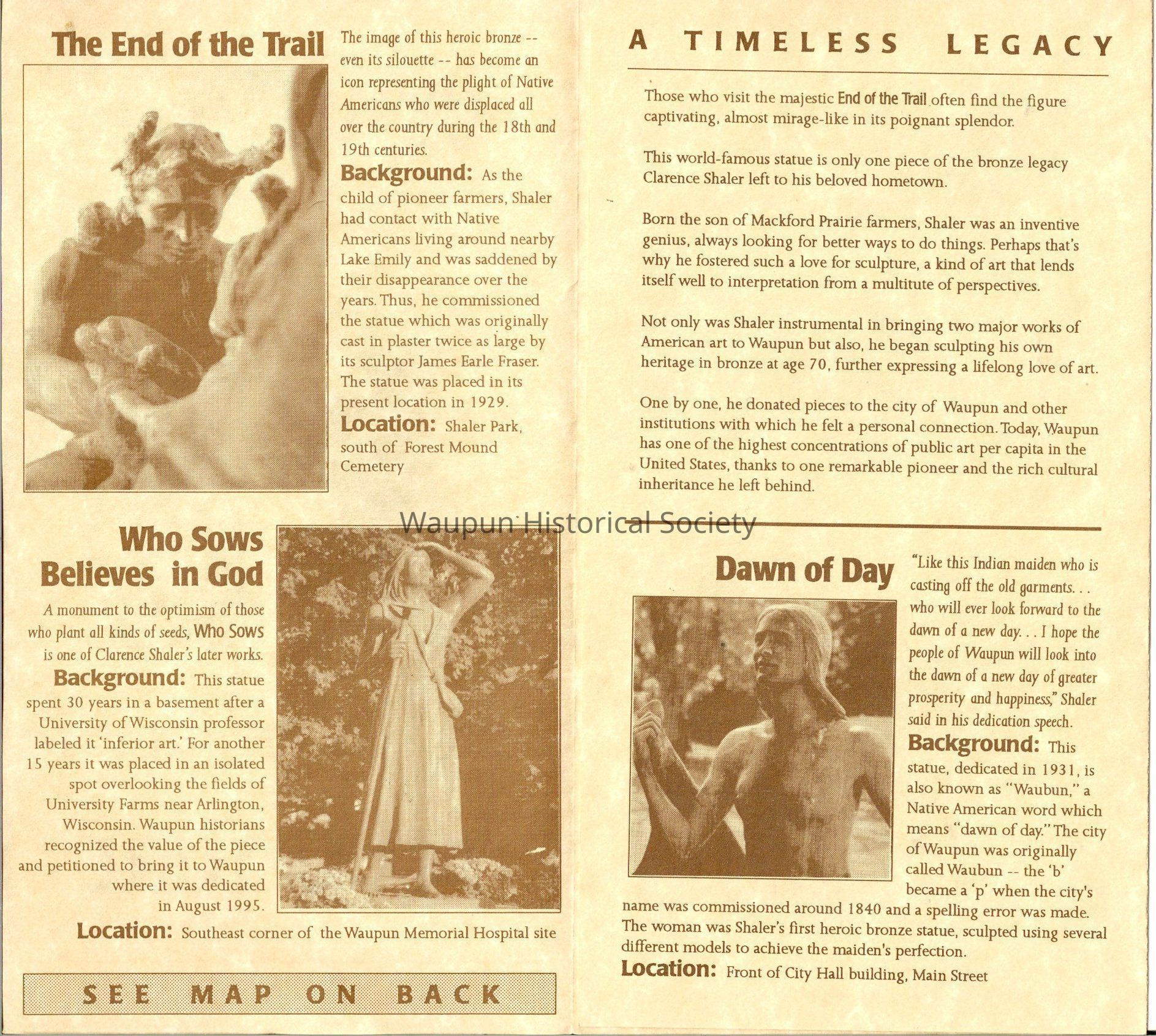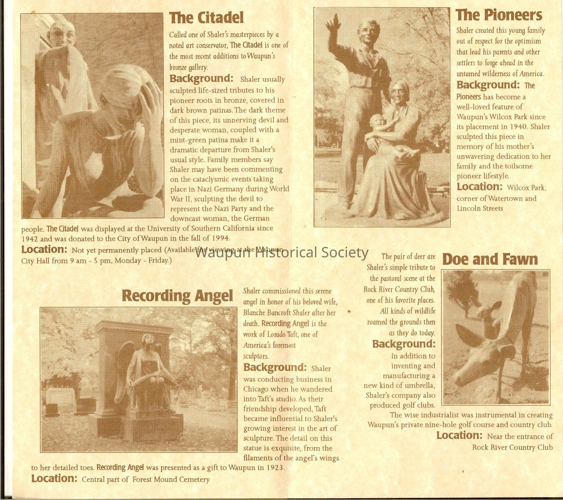 A Pamplets of Waupun, Wisconsin the City of Sculpture the End of the Trail, Who Sows to Believes in God, The Citadel, Recording Angle and the Pioneer and the Doe and Fawn the sculpture of the city of waupun.Acquisition