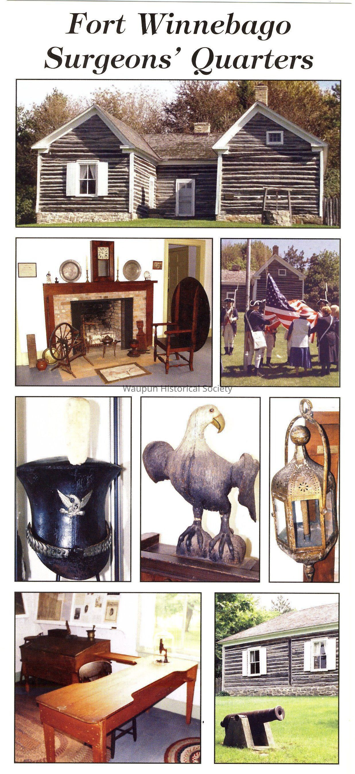 There are 8 color photos of various items of interest at Fort Winnebago Surgeons' Quarters on the front of the pamphlet.