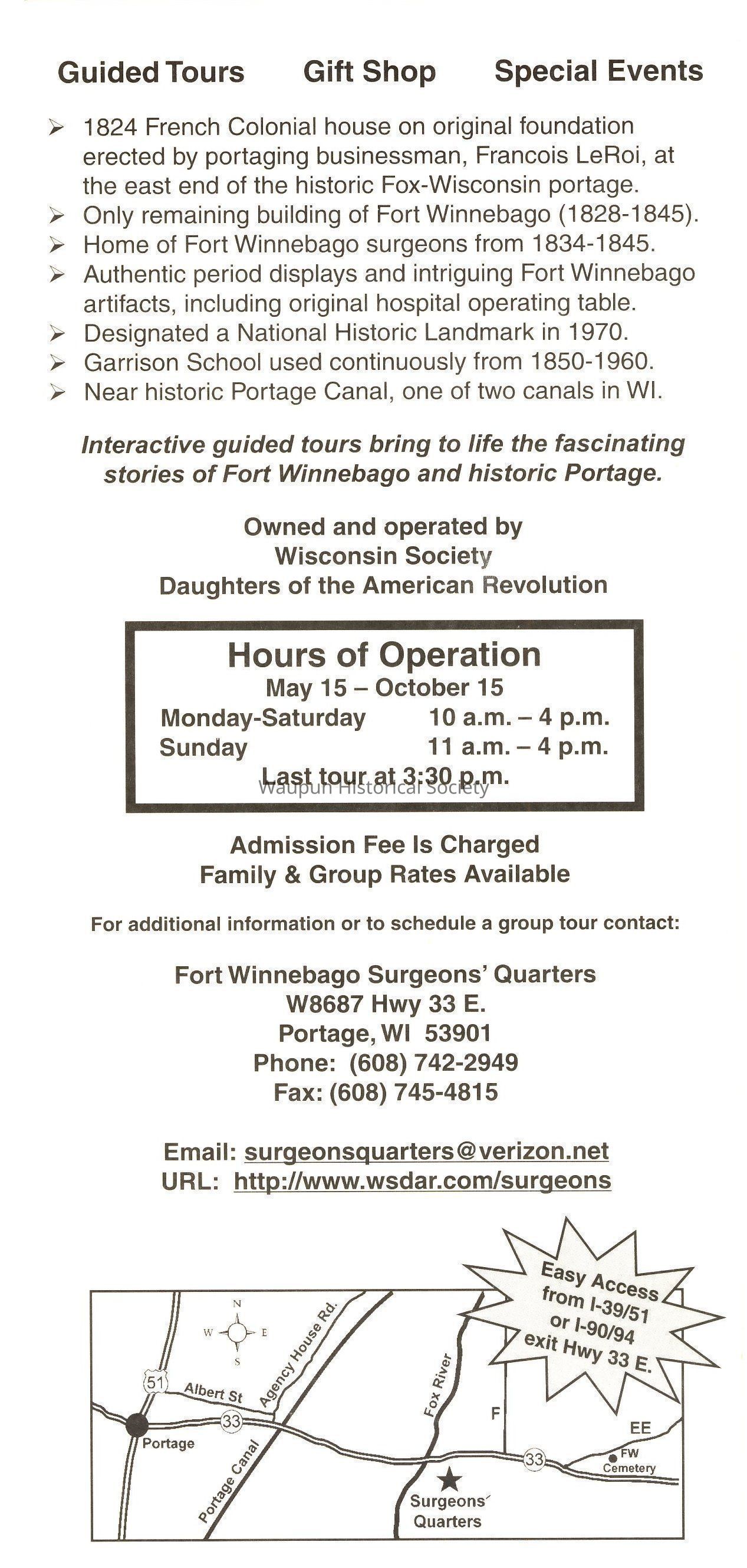 The back has information about Guided Tours, Gift Shop, Special Events and several facts about the Fort. It is ownedand operated by Wisconsin Society Daughters of the American Revolution. The Fort is located at: @W8687 Hwy 33 E., Portage, WI 53901, Phone: (608) 742-2949, Fax, (508) 745-4815