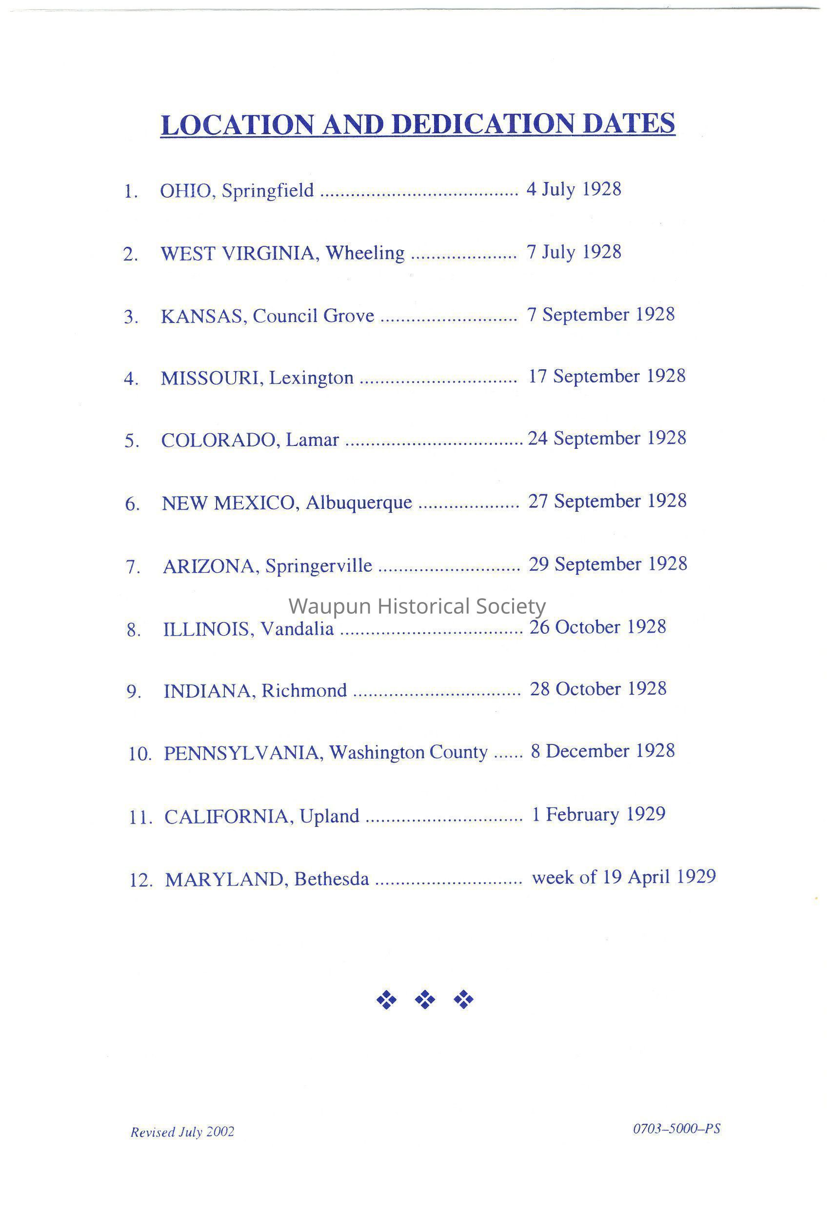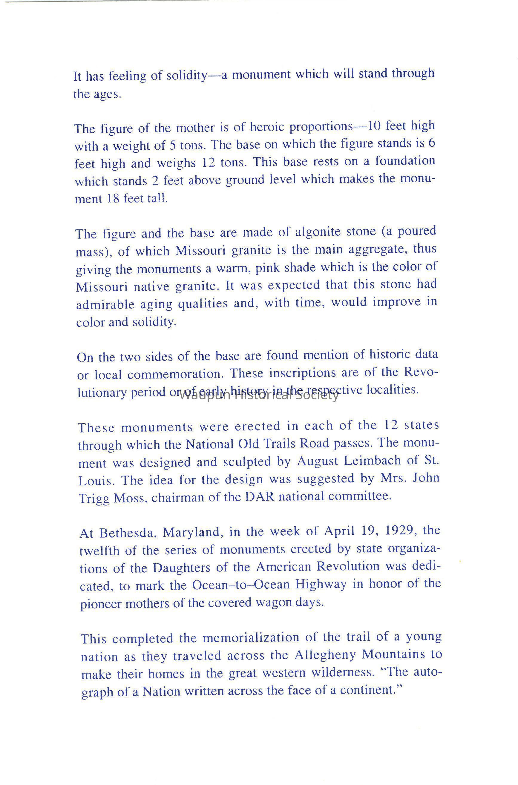 At Bethesda, Maryland, in the week of April 19, 1929, the twelfth of the series of monuments erected by state organizations of the Daughters of the American Revolution was dedicated, to mark the Ocean–to–Ocean Highway in honor of the pioneer mothers of the covered wagon days.