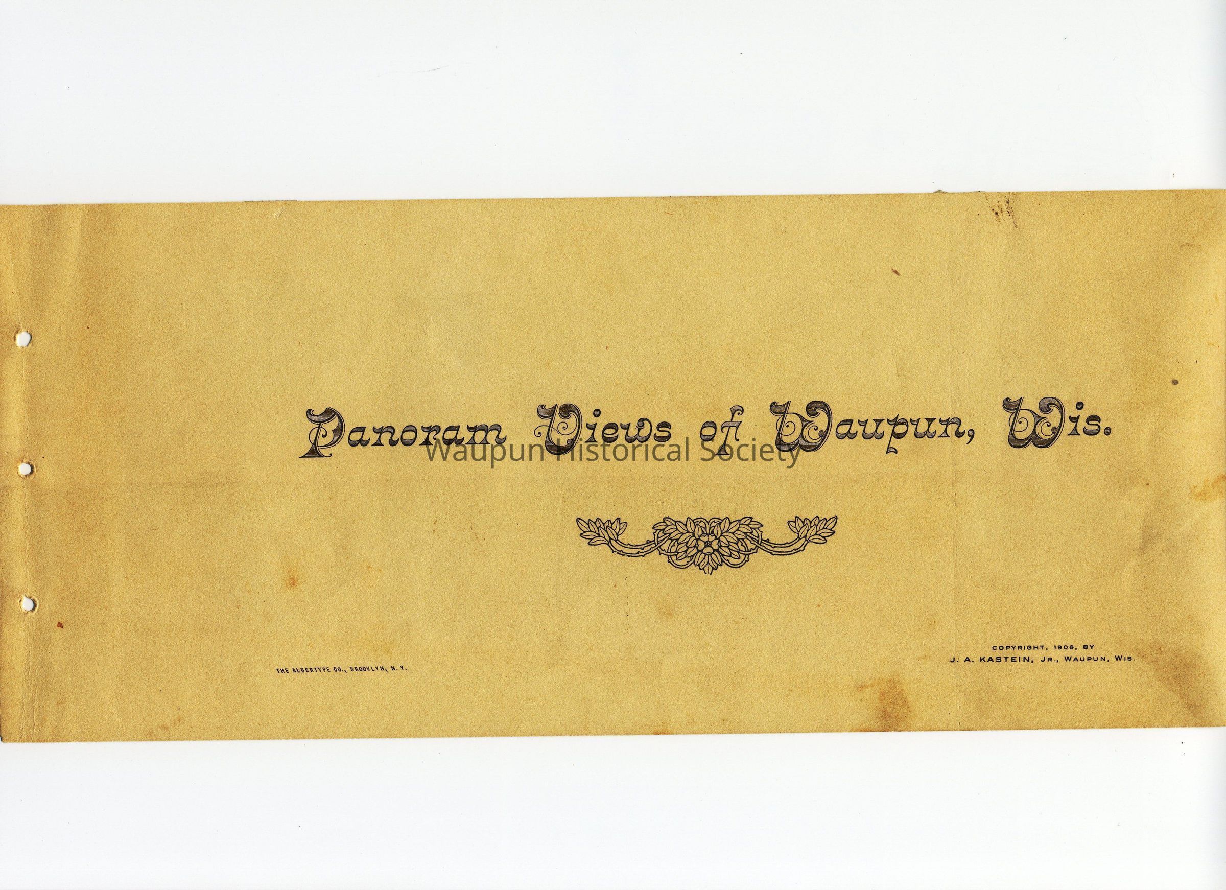 Panoram Views of Waupun. This is a photo taken from a photo booklet with 17 panoramic photos of Waupun Wisconsin. The booklet is entitled "Panorama Views of Waupun, Wisconsin" copyright date of 1906, by J.A. Kastein Jr. Waupun, Wisconsin, and published by "The Albertype Co., Brooklyn, N.Y.Acquisition