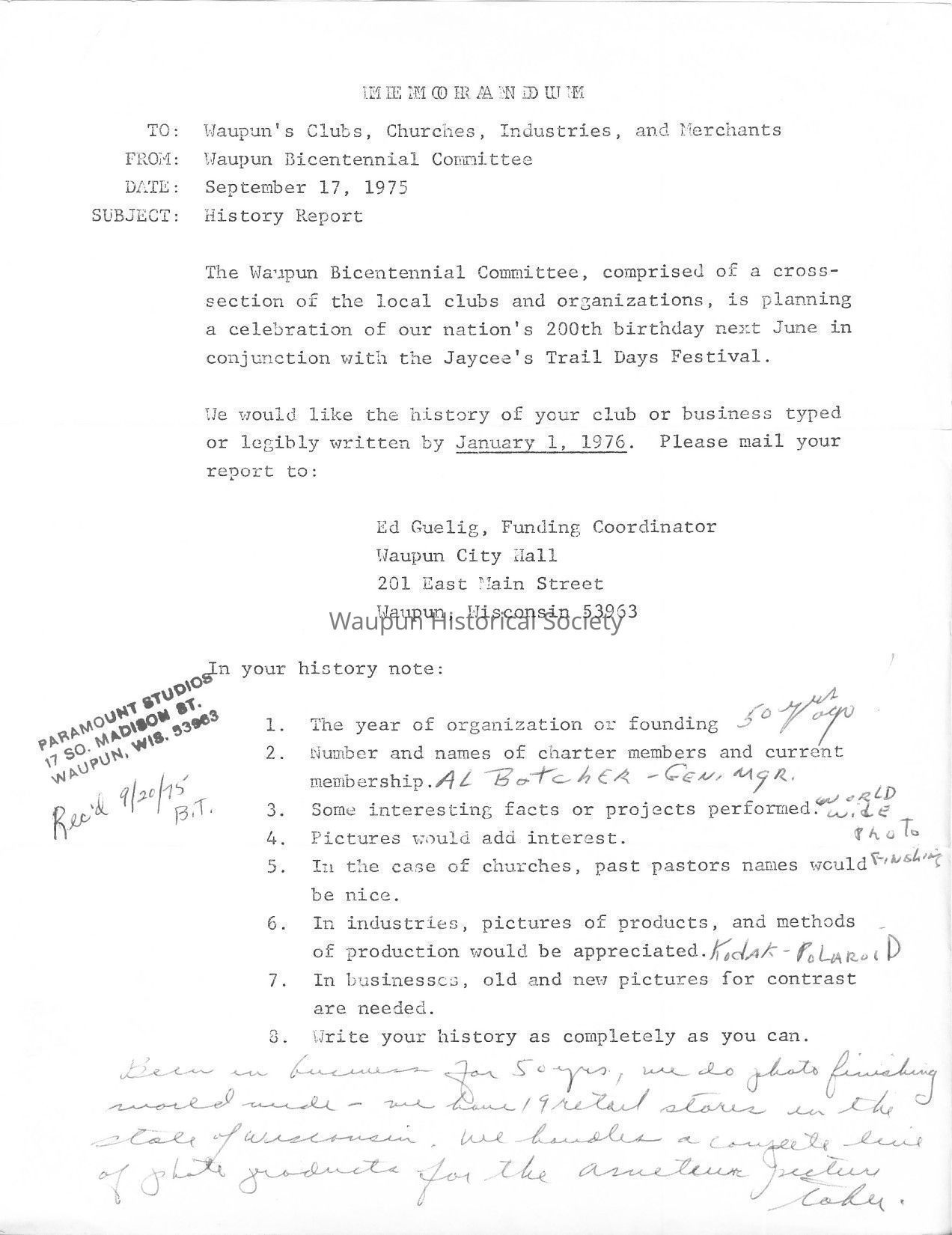 Historical information on Paramount Studios for 1976 Bicentennial Celebration in Waupun, WI.