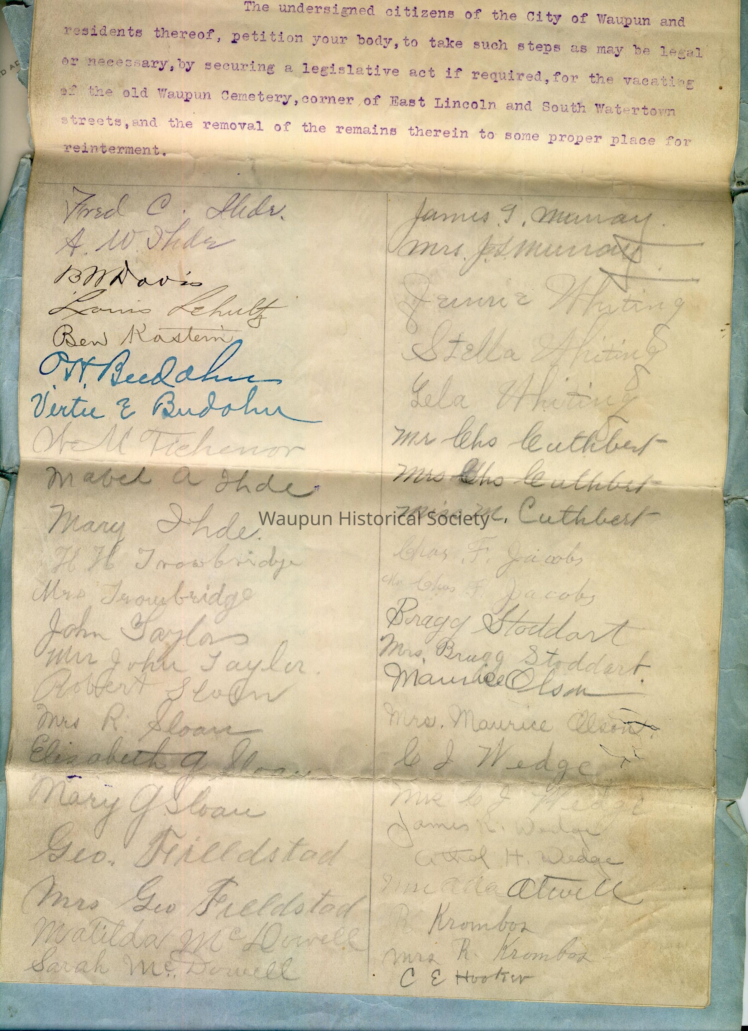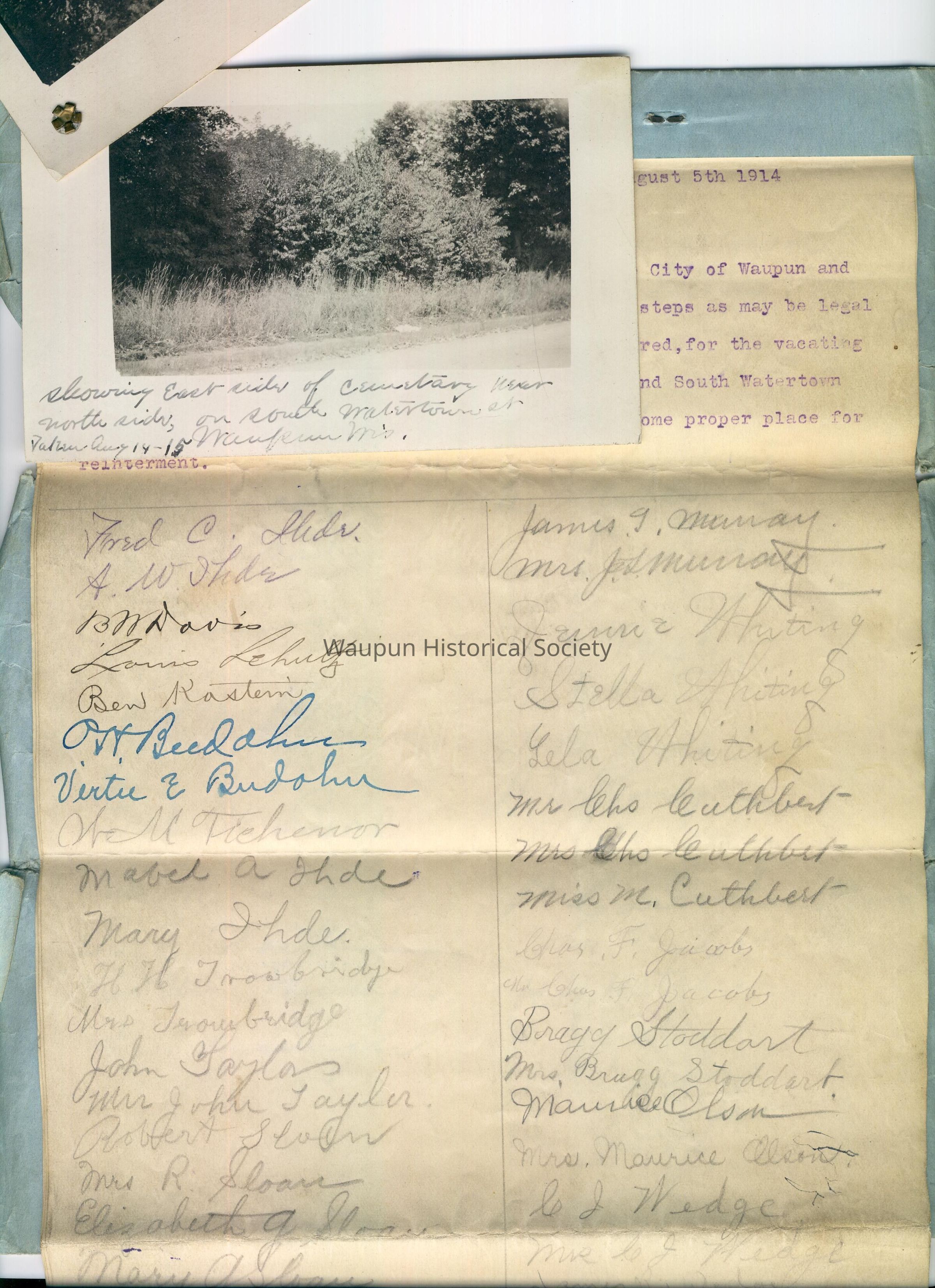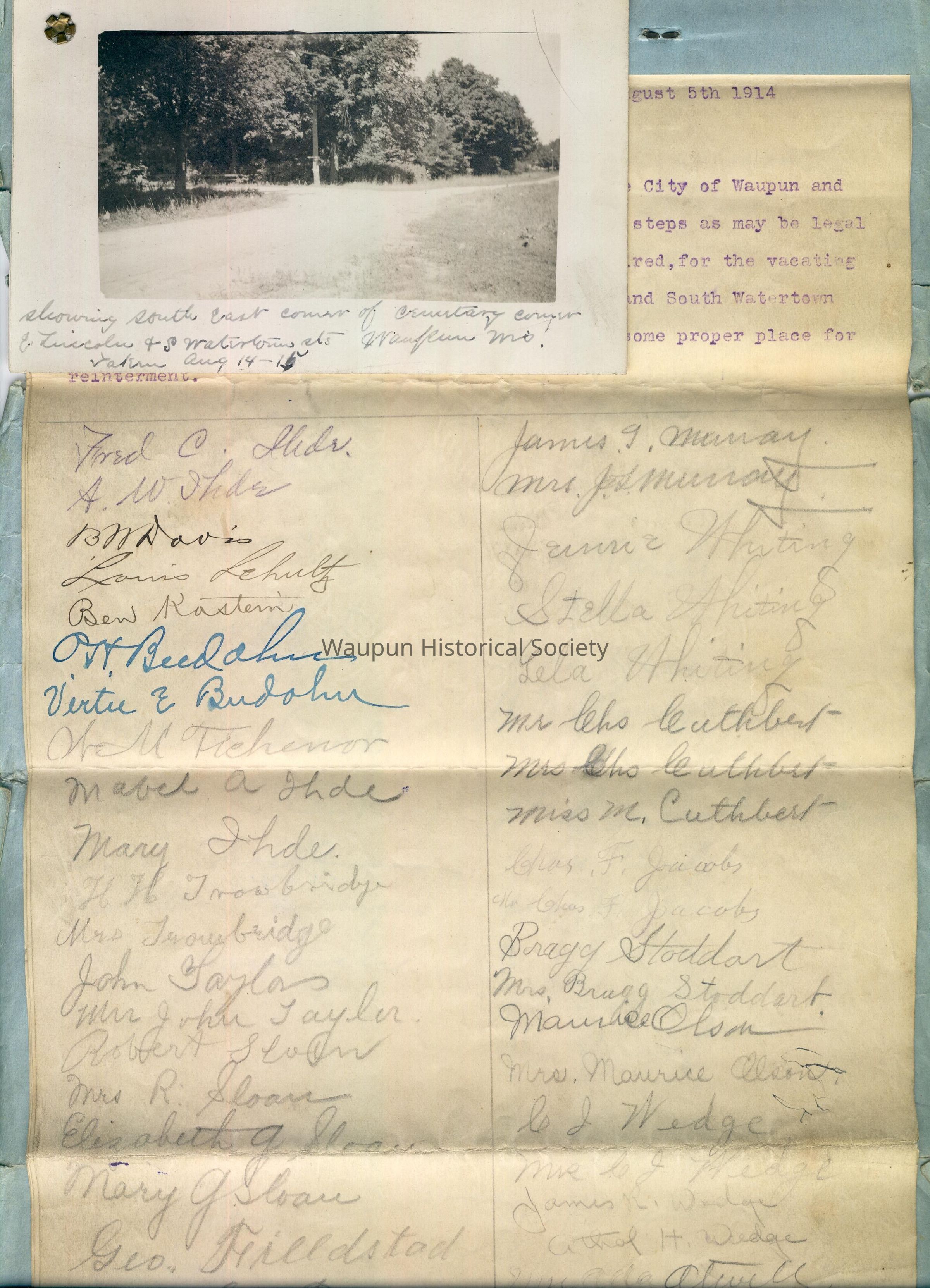 Parks, Wilcox, Cemetery, Old Waupun Cemetery. To the Common Council of the City of Waupun, dated Waupun, Wis. August 5th, 1914. The undersigned citizens of the City of Waupun and residents thereof, petition your body, to take such steps as may be legal or necessary, by securing a legislative act if required, for the vacating of the old Waupun Cemetery, corner of East Lincoln and South Watertown streets, and the removal of the remains therein to some proper place for reinterment. Original signatures plus early photograph of what the cemetery looked like, taken from the corner of Watertown and Lincoln streets, approximately 1915. Many early residents have their signatures on this petition.Acquisition