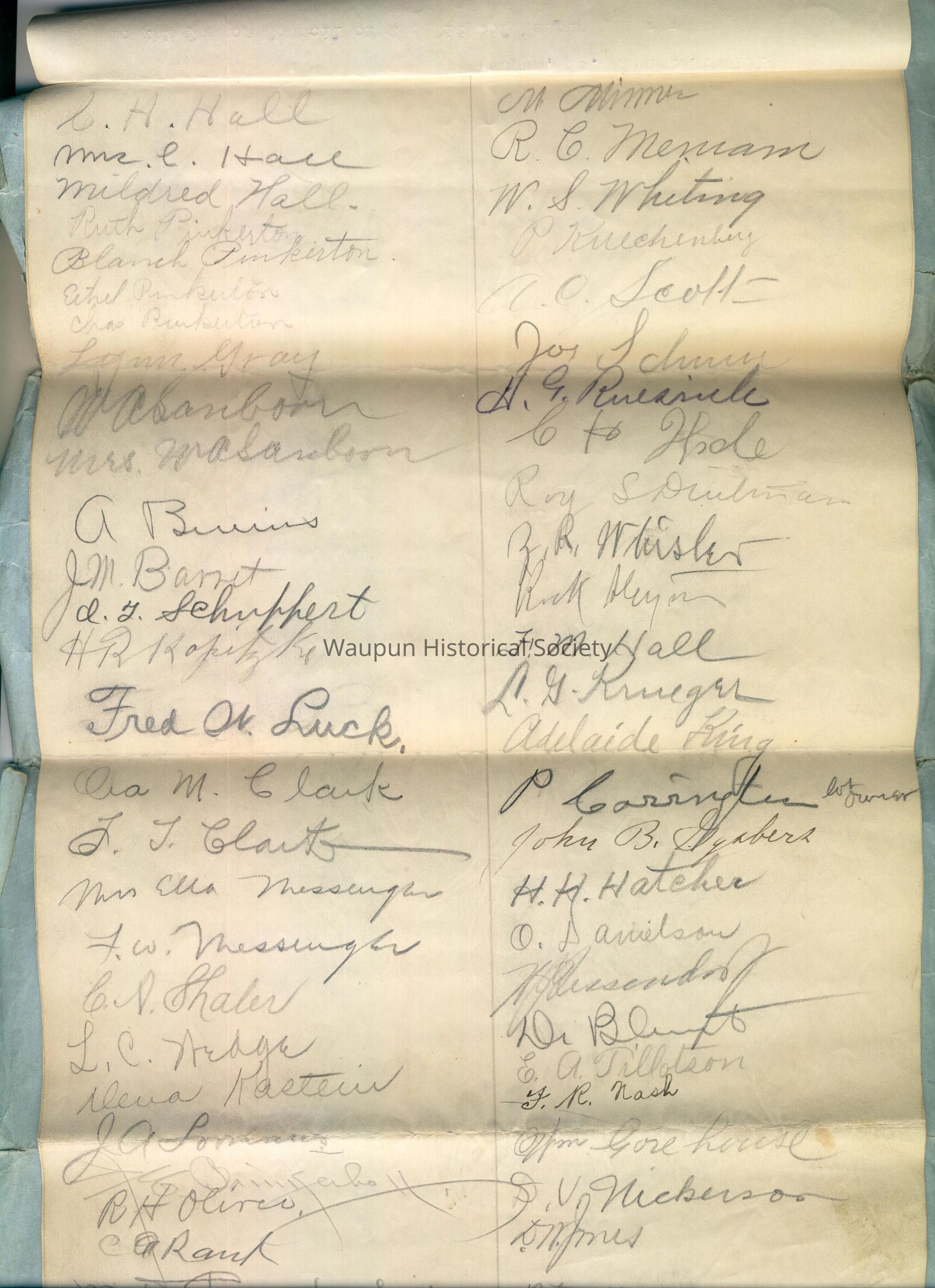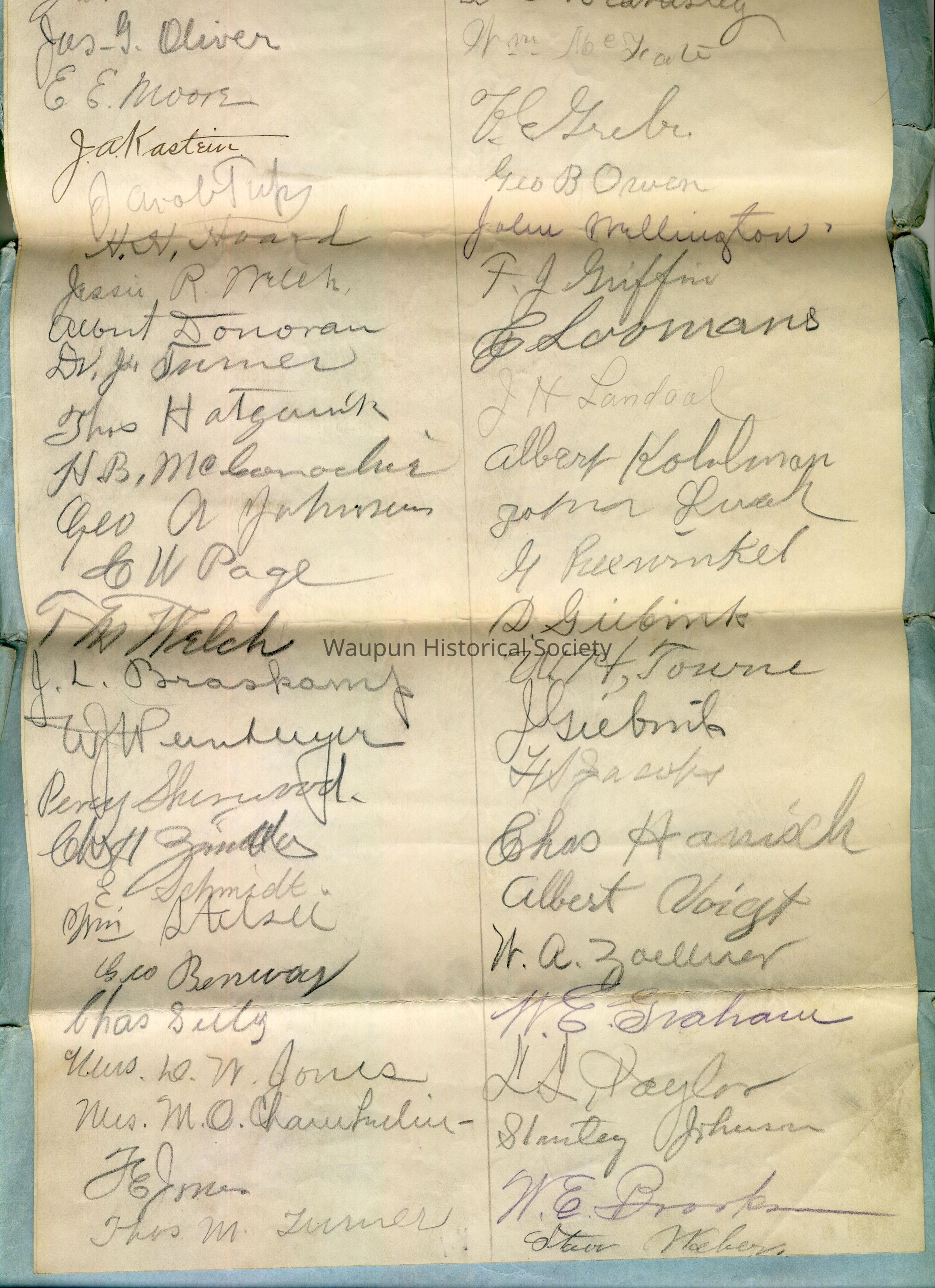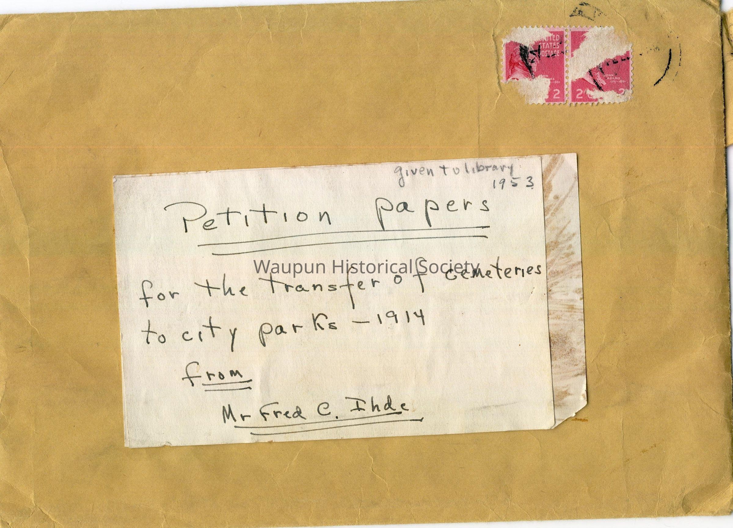 Parks, Wilcox, Cemetery, Old Waupun Cemetery. To the Common Council of the City of Waupun, dated Waupun, Wis. August 5th, 1914. The undersigned citizens of the City of Waupun and residents thereof, petition your body, to take such steps as may be legal or necessary, by securing a legislative act if required, for the vacating of the old Waupun Cemetery, corner of East Lincoln and South Watertown streets, and the removal of the remains therein to some proper place for reinterment. Original signatures plus early photograph of what the cemetery looked like, taken from the corner of Watertown and Lincoln streets, approximately 1915. Many early residents have their signatures on this petition.Acquisition