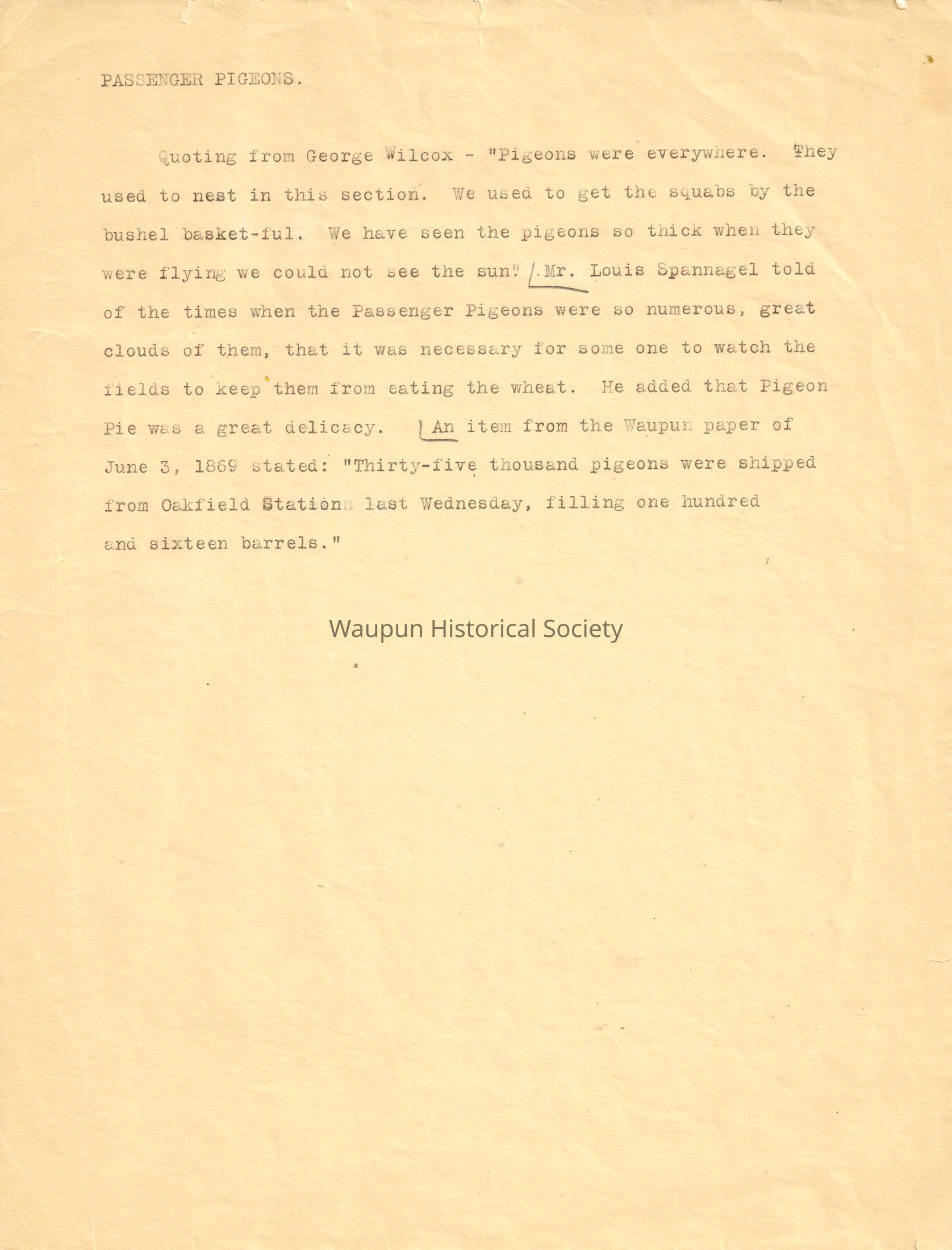 Quoting from George Wilcox - "Pigeons were everywhere. They used to nest in this section. We used to get the squabs by the bushel basketful. We have seen the pigeons so thick when they were flying we could not see the sun." Mr. Louis Spannagel told of the times when the Passenger Pigeons were so numerous, great clouds of them, that it was necessary for some one to watch the fields to keep them from eating the wheat. He added that Pigeon Pie was a great delicacy. An item from the Waupun paper of June 3, 1869 stated: "Thirty-five thousand pigeons were shipped from Oakfield Station last Wednesday, filling one hundred and sixteen barrels."Acquisition