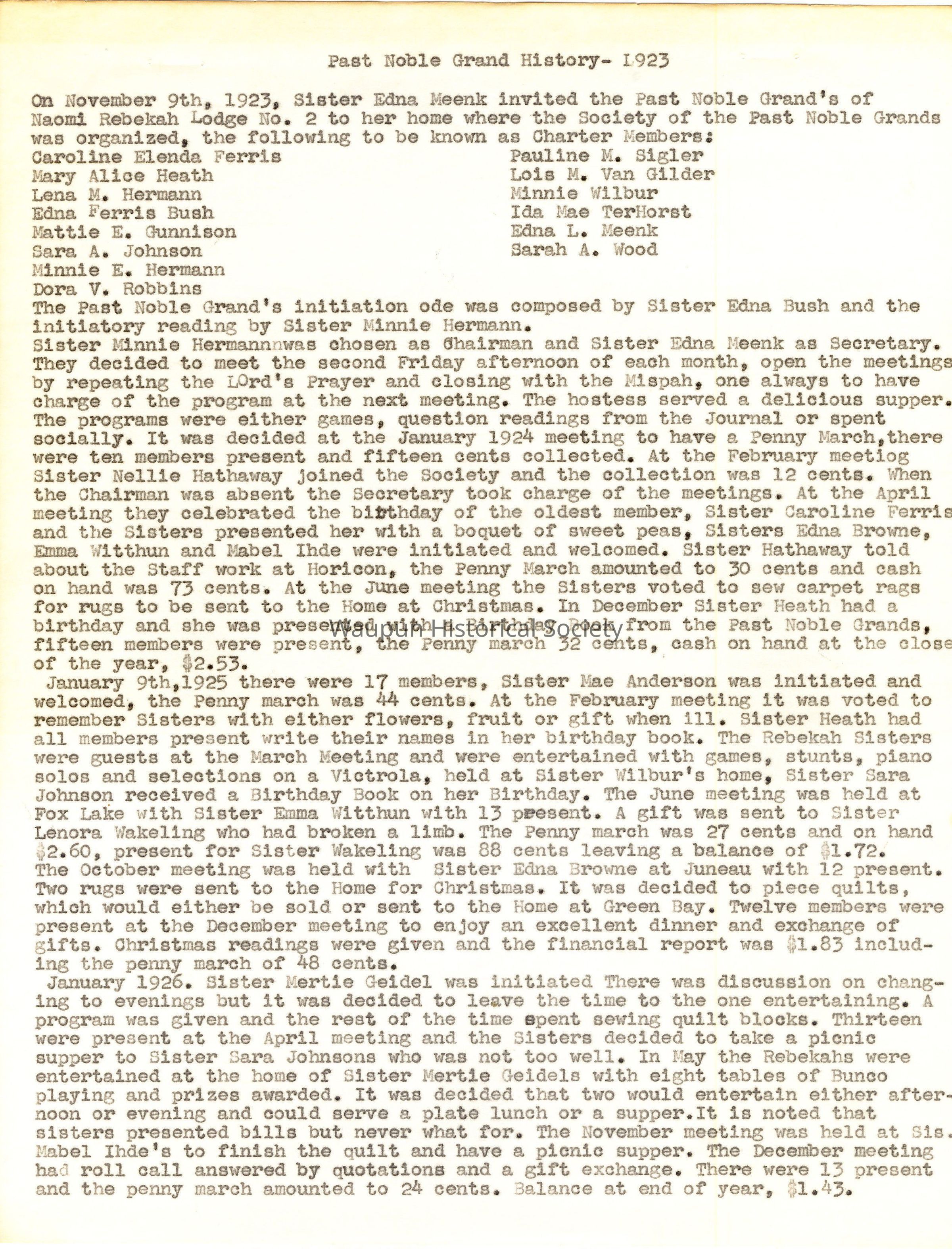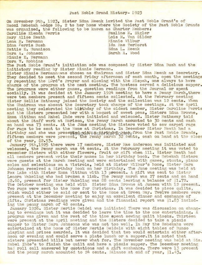 Sister Minnie Hermann was chosen as chairman and Sister Edna Meenk as Secretary. They decided to meet the second Friday afternoon of each month, open the meetings by repeating the Lord's Prayer and closing with the Mispah, one always to have charge of the program at the next meeting. The hostess served a delicious supper. The programs were either games, question readings from the Journal or spent socially. It was decided at the January 1924 meeting to have a Penny March, there were ten members present and fifteen cents collected. At the February meeting Sister Nellie Hathaway joined the Society and the collection was 12 cents. When the Chairman was absent the Secretary took charge of the meetings. At the April meeting they celebrated the birthday of the oldest member, Sister Caroline Ferris and the Sisters presented her with a boquet of sweet peas, Sisters Edna Browne, Emma Witthun and Mabel Ihde were initiated and welcomed. Sister Hathaway told about the Staff work at Horicon, the Penny March amounted to 30 cents and cash on hand was 73 cents. At the June meeting the Sisters voted to sew carpet rags for rugs to be sent to the Home at Christmas. In December Sister Heath had a birthday and she was presented with a Birthday Book from the Past Noble Grande, fifteen members were present, the Penny march 32 cents, cash on hand at the close of the year, $2.53.