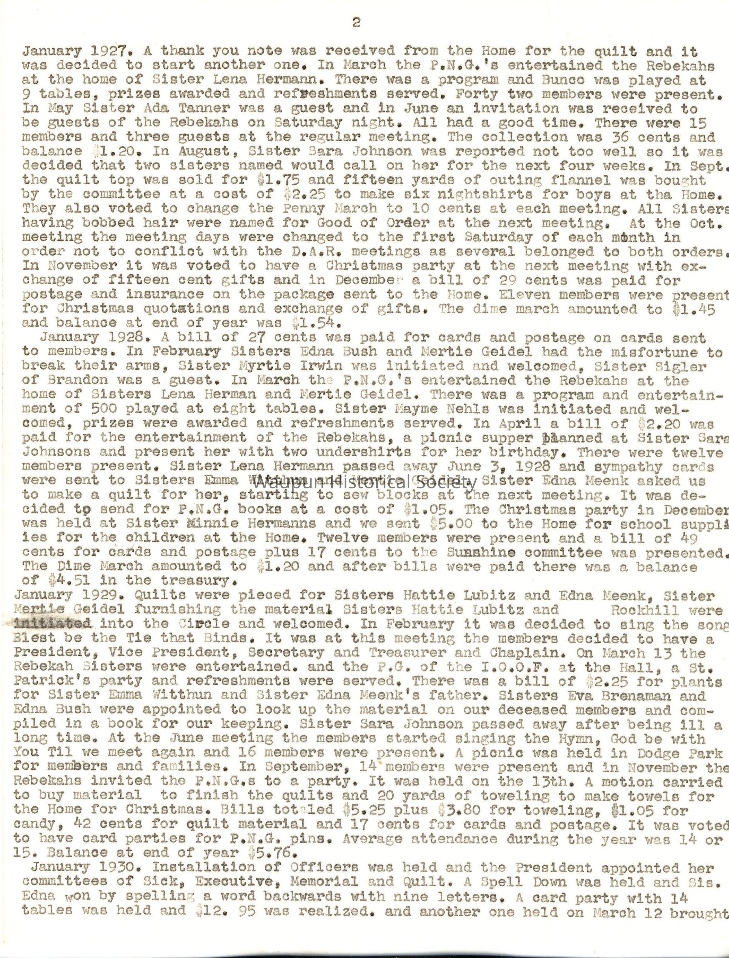 January 1928. A bill of 27 cents was paid for cards and postage on cards sent to members. In February Sisters Edna Bush and Mertie Geidel had the misfortune to break their arms, Sister Myrtle Irwin was initiated and welcomed, Sister Sigler of Brandon was a guest. In March the P.N.G.'s entertained the Rebekahs at the home of Sisters Lena Herman and Mertie Geldel. There was a program and entertainment of 500 played at eight tables. Sister Mayme Nehls was initiated and welcomed, prizes were awarded and refreshments served. In April a bill of $2.20 was paid for the entertainment of the Rebekahs, a picnic supper planned at Sister Sara Johnsons and present her with two undershirts for her birthday. There were twelve members present. Sister Lena Hermann passed away June 3, 1928 and sympathy cards were sent to Sisters Emma Witthun and Mertie Geidel, Sister Edna Meenk asked us to make a quilt for her, starting to sew blocks at the next meeting. It was decided tp send for P.N.G. books at a cost of $1.05. The Christmas party in December was held at Sister Minnie Hermanns and we sent $5.00 to the Home for school supplies for the children at the Home. Twelve members were present and a bill of 49 cents for Cards and postage plus 17 cents to the Sunshine committee was presented. The Dime March amounted to $1.20 and after bills were paid there was a balance of $4.51 in the treasury.