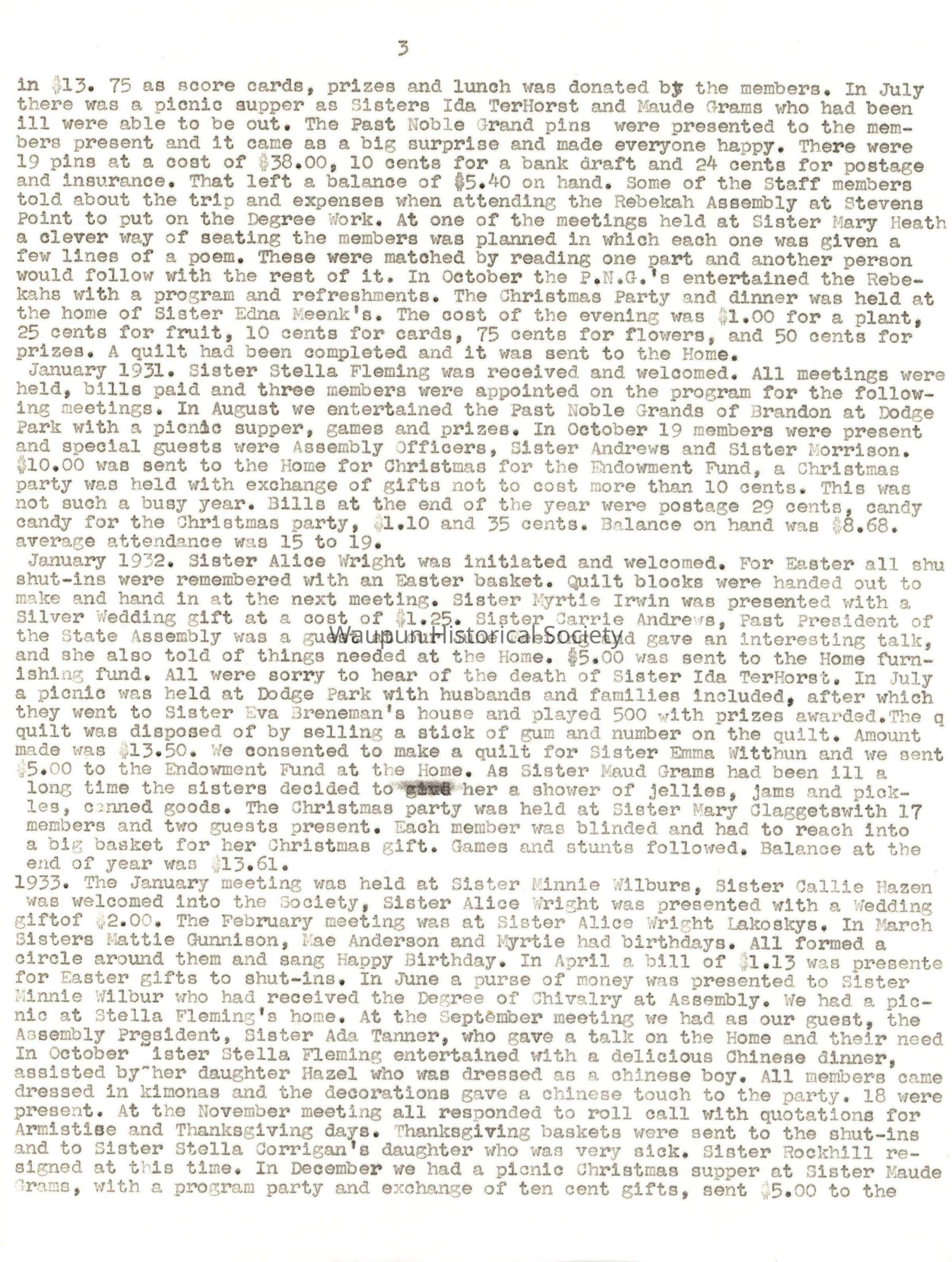 January 1930. Installation of Officers was held and the President appointed her committees of Sick, Executive, Memorial and Quilt. A Spell Down was held and Sis. Edna won by spelling a word backwards with nine letters. A card party with 14 tables was held and $12.95 was realized, and another one held on March 12 brought in $13.75 as score cards, prizes and lunch was donated by the members. In July there was a picnic supper as Sisters Ida TerHorst and Maude Grams who had been ill were able to be out. The Past Noble Grand pins were presented to the members present and it came as a big surprise and made everyone happy. There were 19 pins at a cost of $38.00 10 cents for a bank draft and 24 cents for postage and insurance. That left a balance of $5.40 on hand. Some of the Staff members told about the trip and expenses when attending the Rebekah Assembly at Stevens Point to put on the Degree Work. At one of the meetings held at Sister Mary Heath a clever way of seating the members was planned in which each one was given a few lines of a poem. These were matched by reading one part and another person would follow with the rest of it. In October the P.N.G.'s entertained the Rebekahs with a program and refreshments. The Christmas Party and dinner was held at the home of Sister Edna Meenk's. The cost of the evening was $1.00 for a plant, 25 cents for fruit, 10 cents for cards, 75 cents for flowers, and 50 cents for prizes. A quilt had been completed and it was sent to the Home.