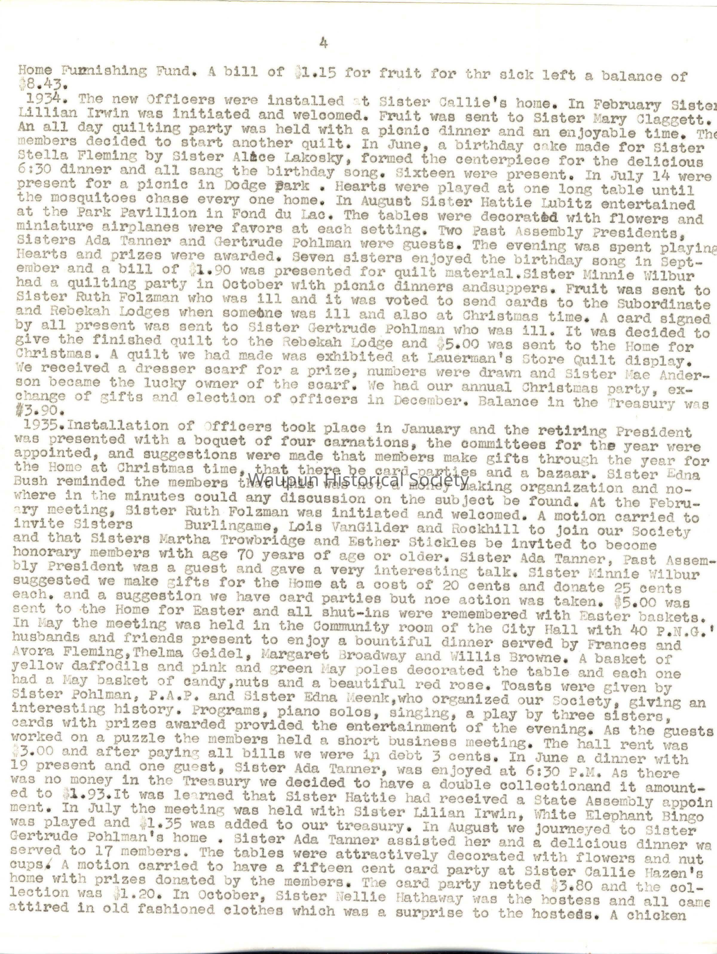 1934. The new Officers were installed at Sister Callie's home. In February Sister Lillian Irwin was initiated and welcomed. Fruit was sent to Sister Mary Claggett. An all day quilting party was held with a picnic dinner and an enjoyable time. The members decided to start another quilt. In June, a birthday cake made for Sister Stella Fleming by Sister Alice Lakosky, formed the centerpiece for the delicious 6:30 dinner and all sang the birthday song. Sixteen were present. In July 14 were present for a picnic in Dodge park. Hearts were played at one long table until the mosquitoes chase every one home. In August Sister Hattie Lubitz entertained at the Park Pavillion in Fond du Lac. The tables were decorated with flowers and miniature air lanes were favors at each setting. Two Past Assembly Presidents, Sisters Ada Tanner and Gertrude Pohlman were guests, The evening was spent playing Hearts and prizes were awarded. Seven sisters enjoyed the birthday song in September and a bill of $1.90 was presented for quilt material. Sister Minnie Wilbur had a quilting party in October with picnic dinners and suppers. Fruit was sent to Sister Ruth Folzman who was ill and it was voted to send cards to the Subordinate and Rebekah Lodges when someone was ill and also at Christmas time. A card signed by all present was sent to Sister Gertrude Pohlman who was ill. It was decided to give the finished quilt to the Rebekah Lodge and $5.00 was sent to the Home for Christmas. A quilt we had made was exhibited at Lauerman's Store Quilt display. We received a dresser scarf for a prize, numbers were drawn and Sister Mae Anderson became the lucky owner of the scarf. We had our annual Christmas party, exchange of gifts and election of officers in December. Balance in the Treasury was $3.90.