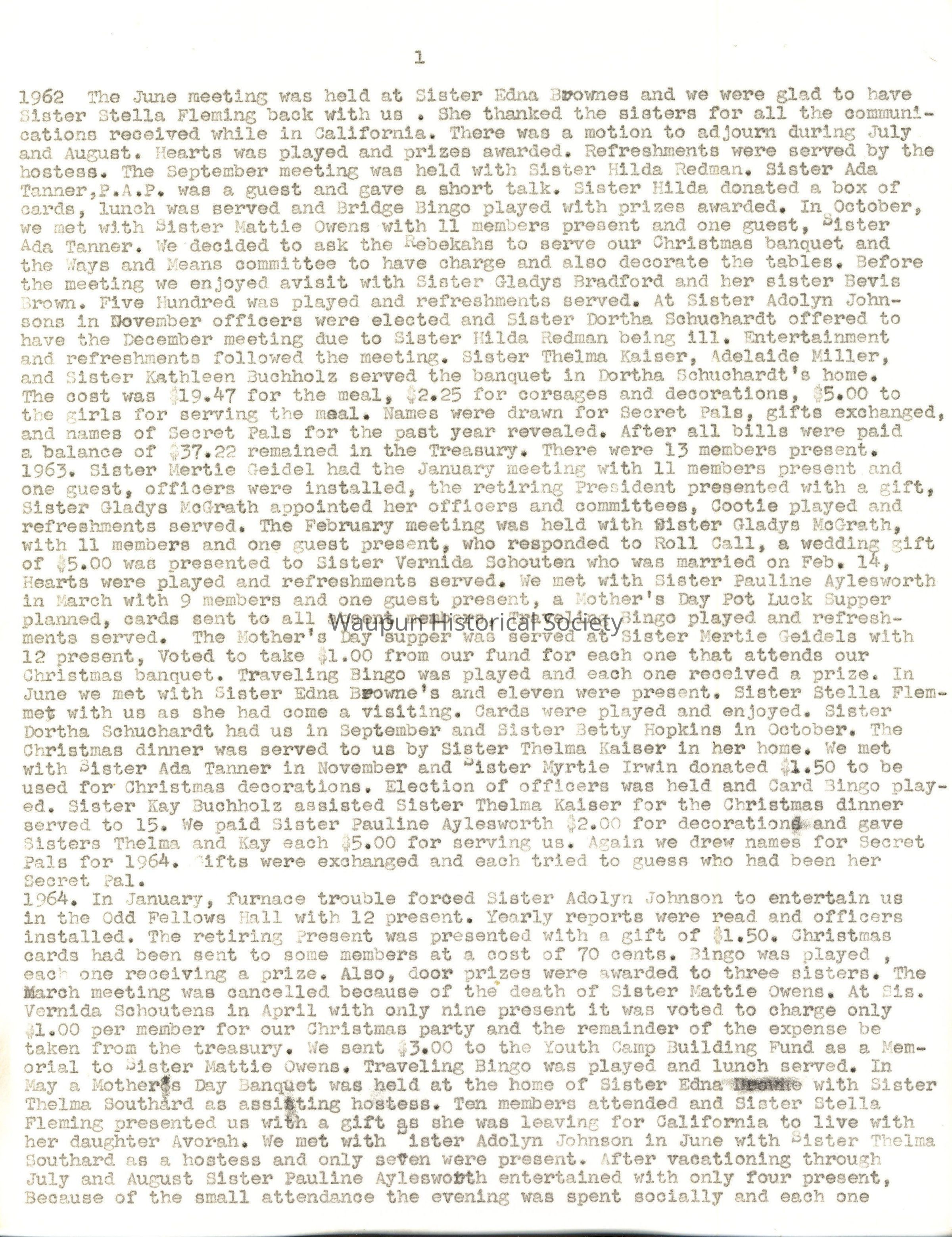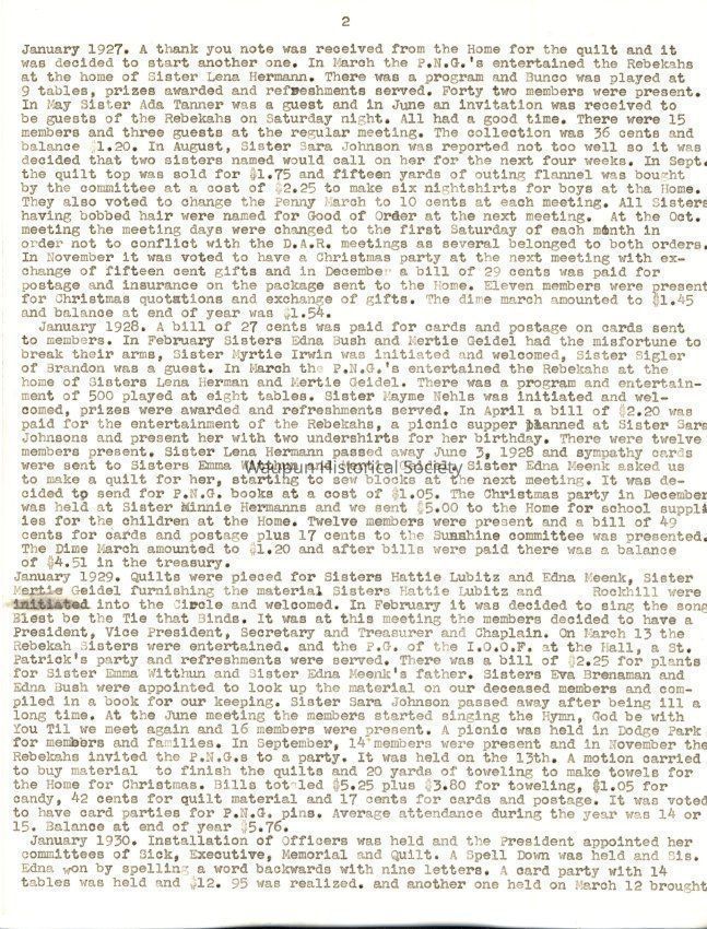 January 1929. Quilts were pieced for Sisters Hattie Lubitz and Edna Heenk, Sister Mertie Geidel furnishing the material Sisters Hattie Lubitz and Rockhill were initiated, into the circle and welcomed. In February it was decided to sing the song Blest be the Tie that Binds. It was at this meeting the members decided to have a President, Vice President, Secretary and Treasurer and Chaplain. On March 13 the Rebekah Sisters were entertained, and the P.G. of the I.O.O.F. at the Hall, a St. Patrick's party and refreshments were served. There was a bill of $2.25 for plants for Sister Emma Witthun and Sister Edna Meenk's father. Sisters Eva Brenaman and Edna Bush were appointed to look up the material on our deceased members and compiled in a book for our keeping. Sister Sara Johnson passed away after being ill a long time. At the June meeting the members started singing the Hymn, God be with You Til we meet again and 16 members were present. A picnic was held in Dodge Park for members and families. In September, 14 members were present and in November the Rebekahs invited the P.N.G.s to a party. It was held on the 13th. A motion carried to buy material to finish the quilts and 20 yards of toweling to make towels for the Home for Christmas. Bills totaled $5.25 plus $3.80 for toweling, $1.05 for candy, 42 cents for quilt material and 17 cents for cards and postage. It was voted to have card parties for P.N.G. pins. Average attendance during the year was 14 or 15. Balance at end of year $5.76.