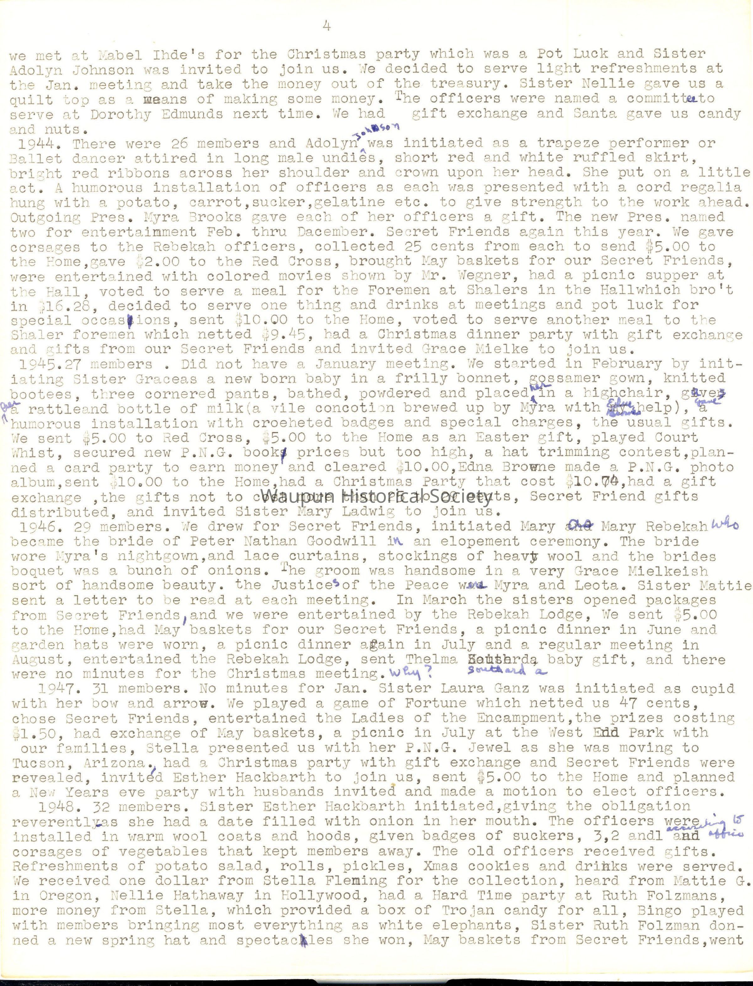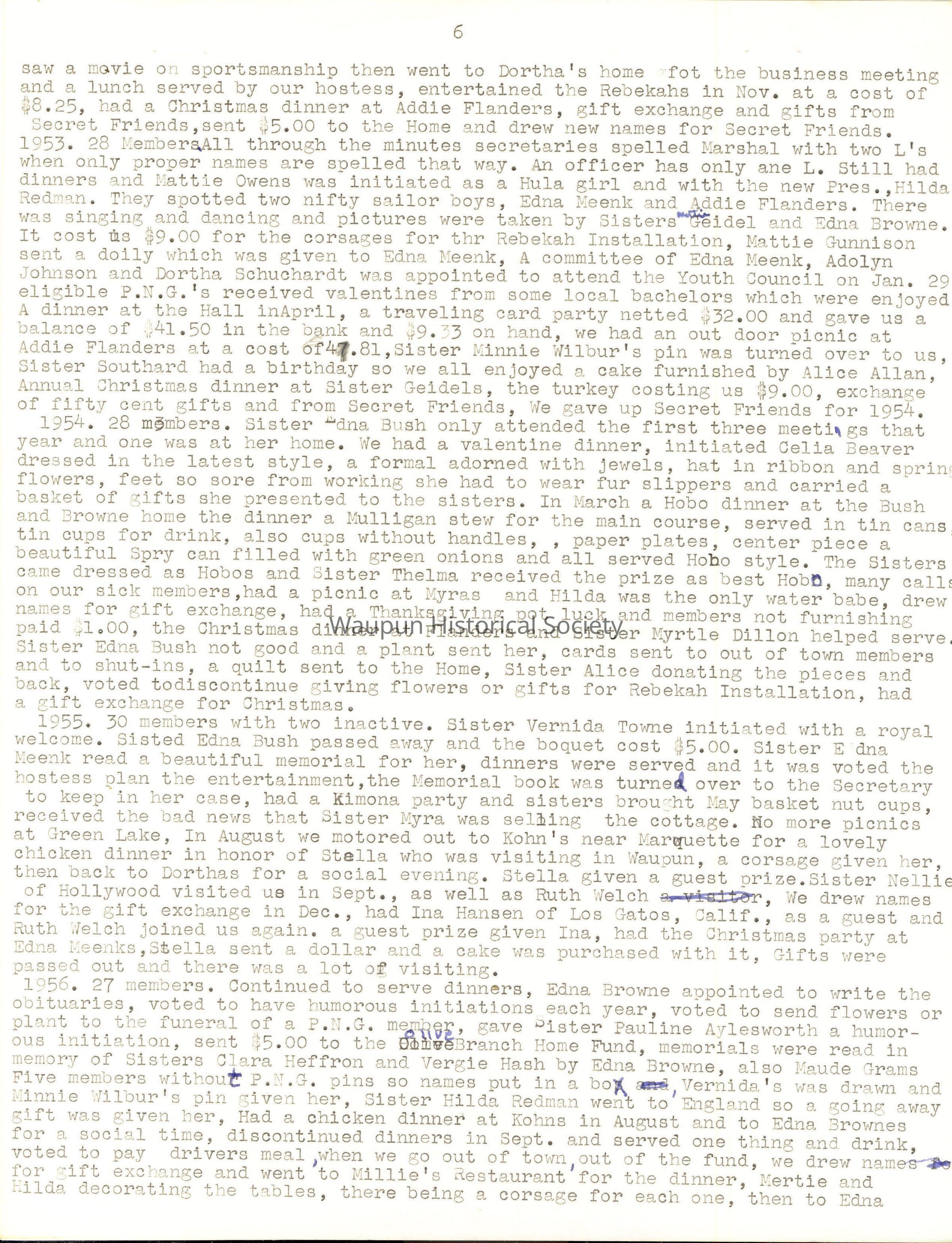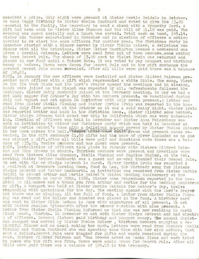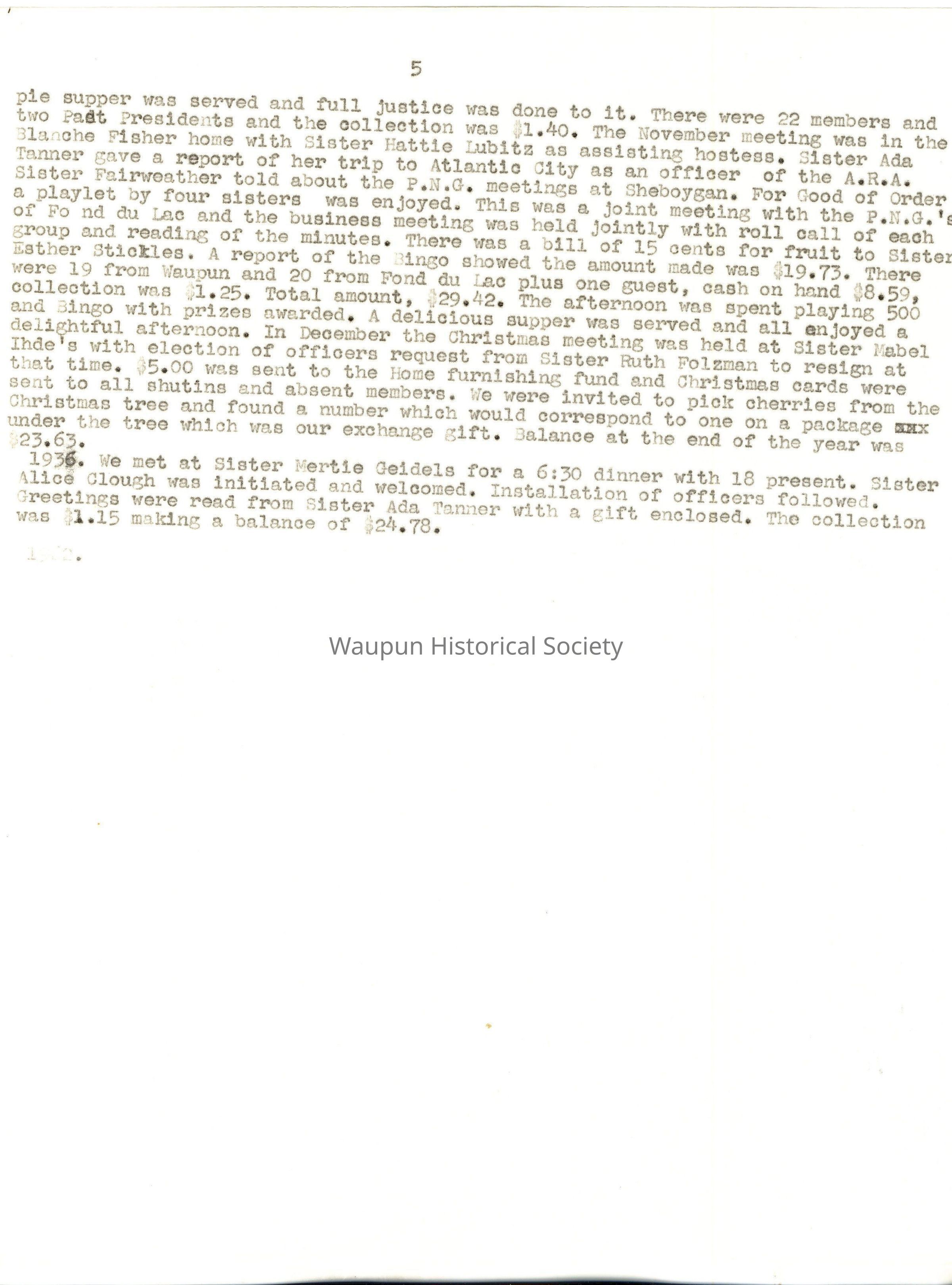 1935.Installation of officers took place in January and the retiring President was presented with a baguet of four carnations, the committees for the year were appointed, and suggestions were made that members make gifts through the year for the Home at Christmas time, that there be card parties and a bazaar. Sister Edna Bush reminded the members that this was not a money making organization and nowhere in the minutes could any discussion on the subject be found. At the February meeting, Sister Ruth Folzman was initiated and welcomed. A motion carried to invite Sisters Burlingame, Lois VanGilder and Rockhill to join our Society and that Sisters Martha Trowbridge and Esther Stickles be invited to become honorary members with age 70 years of age or older. Sister Ada Tanner, Past Assembly President was a guest and gave a very interesting talk. Sister Minnie Wilbur suggested we make lifts for the dome at a cost of 20 cents and donate 25 cents each, and a suggestion we have card parties out noe action was taken. $5.00 was sent to the Home for Easter and all shut-ins were remembered with Easter baskets. In May the meeting was held in the Community room of the City Fall with 40 P.N.G. husbands and friends present to enjoy a bountiful dinner served by Frances and Avora Fleming,Thelma Geidel, Margaret Broadway and Willis Browne. A basket of yellow daffodils and pink and green May poles decorated the table and each one had a May basket of candy, nuts and a beautiful red rose. Toasts were given by Sister Pohlman, P.A.P. and Sister Edna Meenk, who organized our Society, giving an interesting history. Programs, piano solos, singing, a play by three sisters, cards with prizes awarded provided the entertainment of the evening. As the guests worked on a puzzle the members held a short business meeting. The hall rent was $3.00 and after paying all bills we were in debt 3 cents. In June a dinner with 19 present and one guest, Sister Ada Tanner, was enjoyed at 6:30 P.M. As there was no money in the Treasury we decided to have a double collection and it amounted to $1.93.1t was learned that Sister Hattie had received a State Assembly appointment. In July the meeting was held with Sister Lilian Irwin, White Elephant Bingo was played and $1.35 was added to our treasury. In August we journeyed to Sister Gertrude Pohlean's home. Sister Ada Tanner assisted her and a delicious dinner was served to 17 members. The tables were attractively decorated with flowers and nut cups. A motion carried to have a fifteen cent card party at Sister Callie Hazen's home with prizes donated by the members. The card party netted $3.80 and the collection was $1.20. In October, Sister Neellie Hathaway was the hostess and all cane attired in old fashioned clothes which was a surprise to the hostess. A chicken pie supper was served and full justice was done to it. There were 22 members and two Past Presidents and the collection was $1.40. The November meeting was in the B1anche Fisher home with Sister Hattie Lubitz as assisting hostess. Sister Ada Tanner gave a report of her trip to Atlantic City as an officer of the A.R.A. Sister Fairweather told about, the P.N.G. meetings at Sheboygan. For Good of Order a playlet by four sisters was enjoyed. This was a joint meeting with the P.N.G.'s of Fond du Lac and the business meeting was held jointly with roll call of each group and reading of the minutes. There was a bill of 15 cents for fruit to Sister Esther Stickles. A report of the Bingo showed the amount made was $19.73. There were 19 from Waupun and 20 from Fond du Lao plus one guest, cash on hand $8.59, collection was $1.25. Total amount, $29.42. The afternoon was spent playing 500 and Bingo with prizes awarded. A delicious supper was served and all enjoyed a delightful afternoon. In December the Christmas meeting was held at Sister Label Ihde's with election of officers request from Sister Ruth Folzman to resign at that time. $5.00 was sent to the home furnishing fund and Christmas cards were seat to all shut-ins and absent members. We were invited to pick cherries from the Christmas tree and found a number which would correspond to one on a package mix under the tree which was our exchange gift. Balance at the end of the year was $23.63.