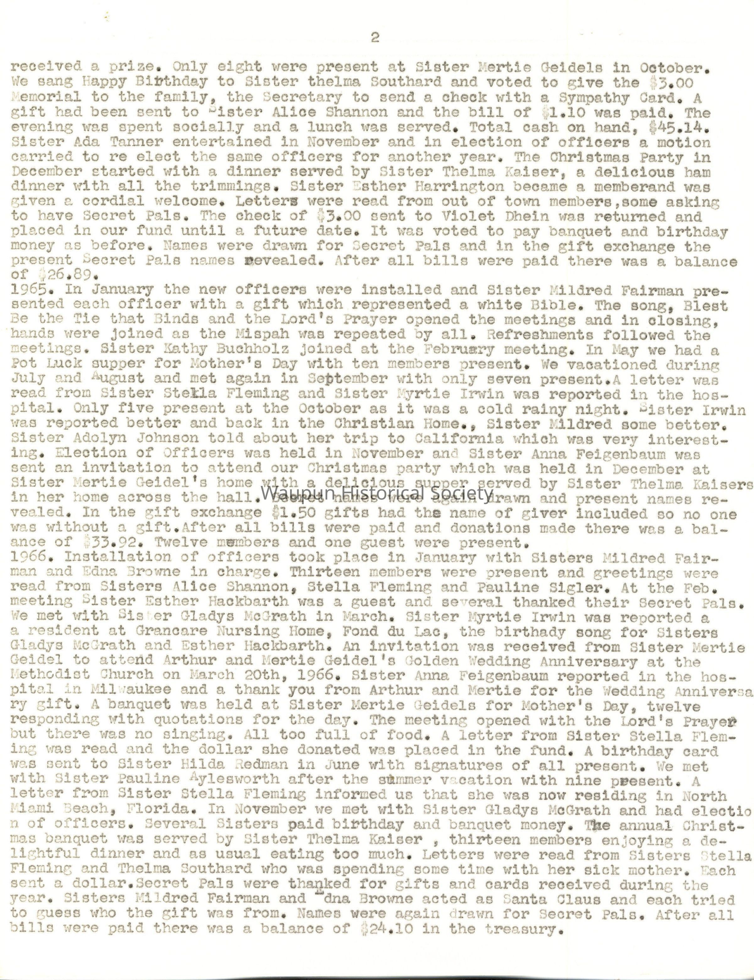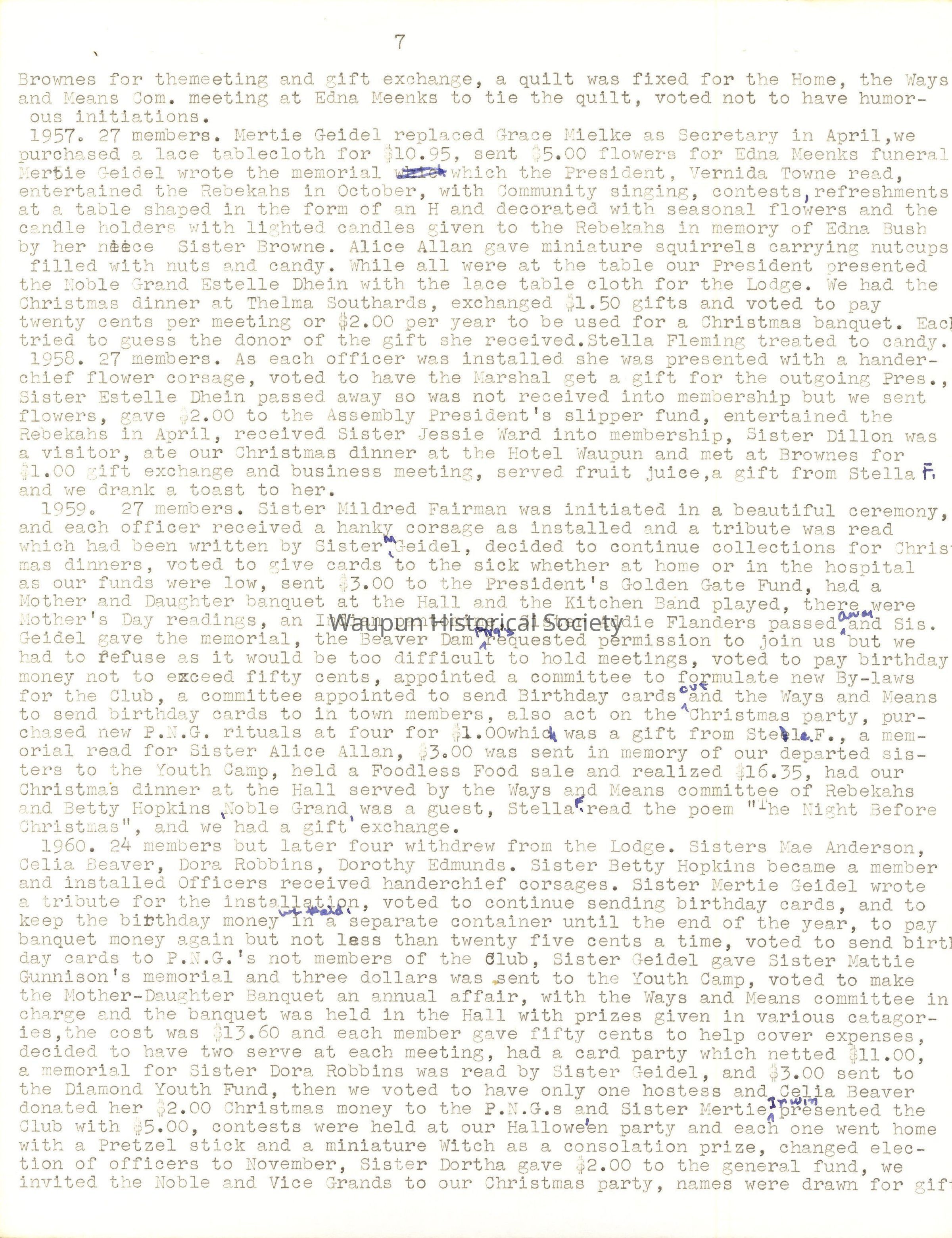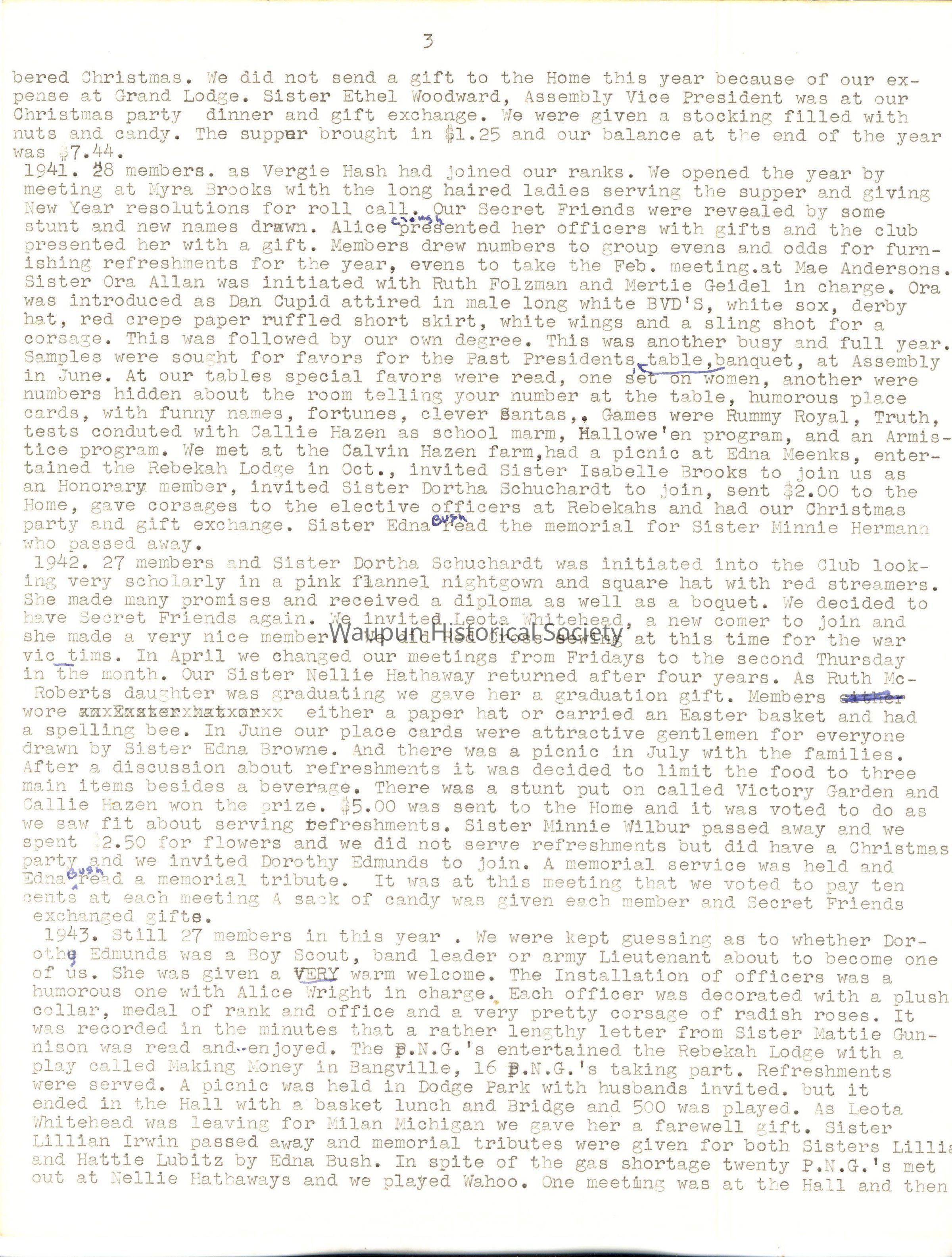 1935.Installation of officers took place in January and the retiring President was presented with a baguet of four carnations, the committees for the year were appointed, and suggestions were made that members make gifts through the year for the Home at Christmas time, that there be card parties and a bazaar. Sister Edna Bush reminded the members that this was not a money making organization and nowhere in the minutes could any discussion on the subject be found. At the February meeting, Sister Ruth Folzman was initiated and welcomed. A motion carried to invite Sisters Burlingame, Lois VanGilder and Rockhill to join our Society and that Sisters Martha Trowbridge and Esther Stickles be invited to become honorary members with age 70 years of age or older. Sister Ada Tanner, Past Assembly President was a guest and gave a very interesting talk. Sister Minnie Wilbur suggested we make lifts for the dome at a cost of 20 cents and donate 25 cents each, and a suggestion we have card parties out noe action was taken. $5.00 was sent to the Home for Easter and all shut-ins were remembered with Easter baskets. In May the meeting was held in the Community room of the City Fall with 40 P.N.G. husbands and friends present to enjoy a bountiful dinner served by Frances and Avora Fleming,Thelma Geidel, Margaret Broadway and Willis Browne. A basket of yellow daffodils and pink and green May poles decorated the table and each one had a May basket of candy, nuts and a beautiful red rose. Toasts were given by Sister Pohlman, P.A.P. and Sister Edna Meenk, who organized our Society, giving an interesting history. Programs, piano solos, singing, a play by three sisters, cards with prizes awarded provided the entertainment of the evening. As the guests worked on a puzzle the members held a short business meeting. The hall rent was $3.00 and after paying all bills we were in debt 3 cents. In June a dinner with 19 present and one guest, Sister Ada Tanner, was enjoyed at 6:30 P.M. As there was no money in the Treasury we decided to have a double collection and it amounted to $1.93.1t was learned that Sister Hattie had received a State Assembly appointment. In July the meeting was held with Sister Lilian Irwin, White Elephant Bingo was played and $1.35 was added to our treasury. In August we journeyed to Sister Gertrude Pohlean's home. Sister Ada Tanner assisted her and a delicious dinner was served to 17 members. The tables were attractively decorated with flowers and nut cups. A motion carried to have a fifteen cent card party at Sister Callie Hazen's home with prizes donated by the members. The card party netted $3.80 and the collection was $1.20. In October, Sister Neellie Hathaway was the hostess and all cane attired in old fashioned clothes which was a surprise to the hostess. A chicken pie supper was served and full justice was done to it. There were 22 members and two Past Presidents and the collection was $1.40. The November meeting was in the B1anche Fisher home with Sister Hattie Lubitz as assisting hostess. Sister Ada Tanner gave a report of her trip to Atlantic City as an officer of the A.R.A. Sister Fairweather told about, the P.N.G. meetings at Sheboygan. For Good of Order a playlet by four sisters was enjoyed. This was a joint meeting with the P.N.G.'s of Fond du Lac and the business meeting was held jointly with roll call of each group and reading of the minutes. There was a bill of 15 cents for fruit to Sister Esther Stickles. A report of the Bingo showed the amount made was $19.73. There were 19 from Waupun and 20 from Fond du Lao plus one guest, cash on hand $8.59, collection was $1.25. Total amount, $29.42. The afternoon was spent playing 500 and Bingo with prizes awarded. A delicious supper was served and all enjoyed a delightful afternoon. In December the Christmas meeting was held at Sister Label Ihde's with election of officers request from Sister Ruth Folzman to resign at that time. $5.00 was sent to the home furnishing fund and Christmas cards were seat to all shut-ins and absent members. We were invited to pick cherries from the Christmas tree and found a number which would correspond to one on a package mix under the tree which was our exchange gift. Balance at the end of the year was $23.63.