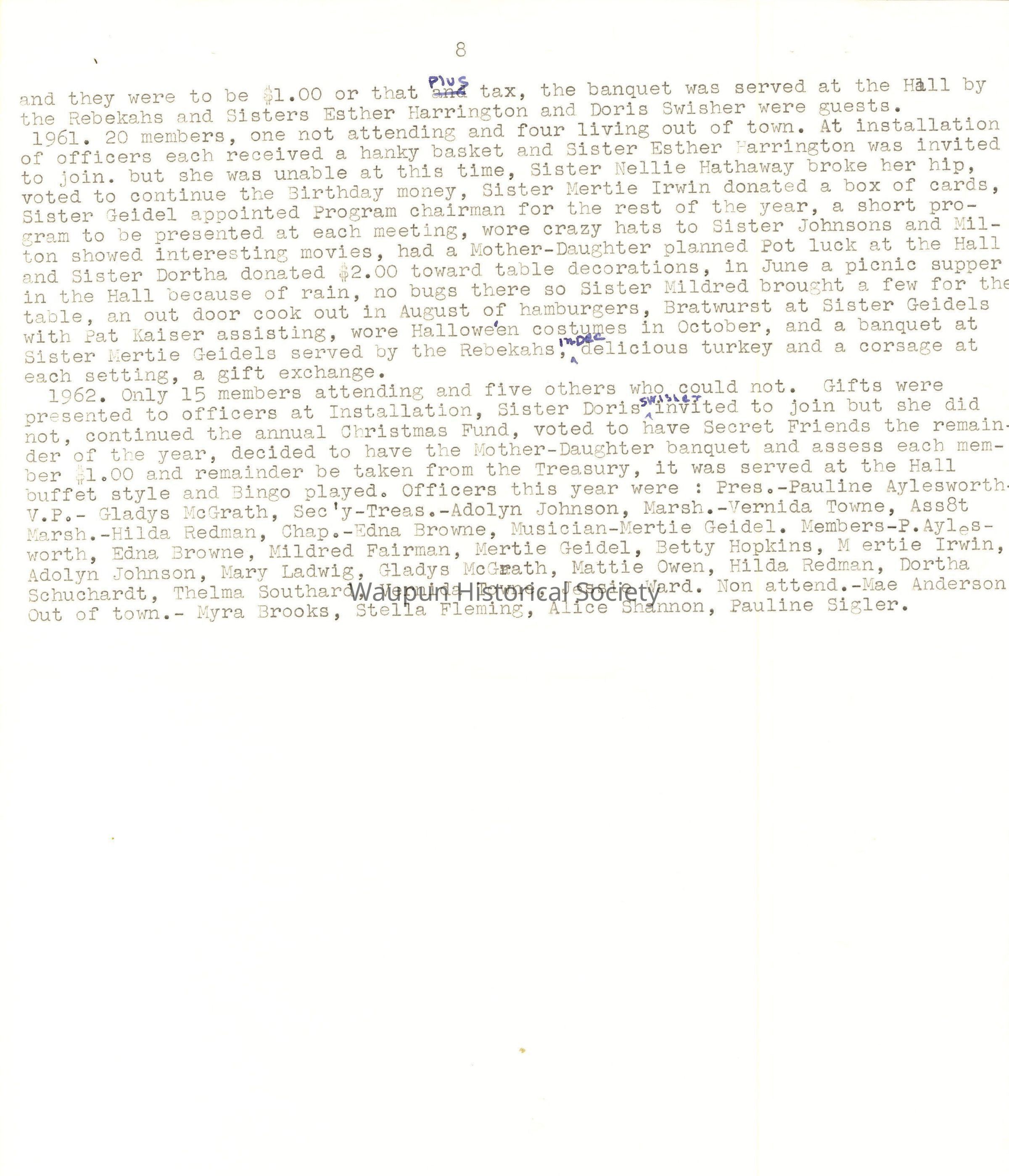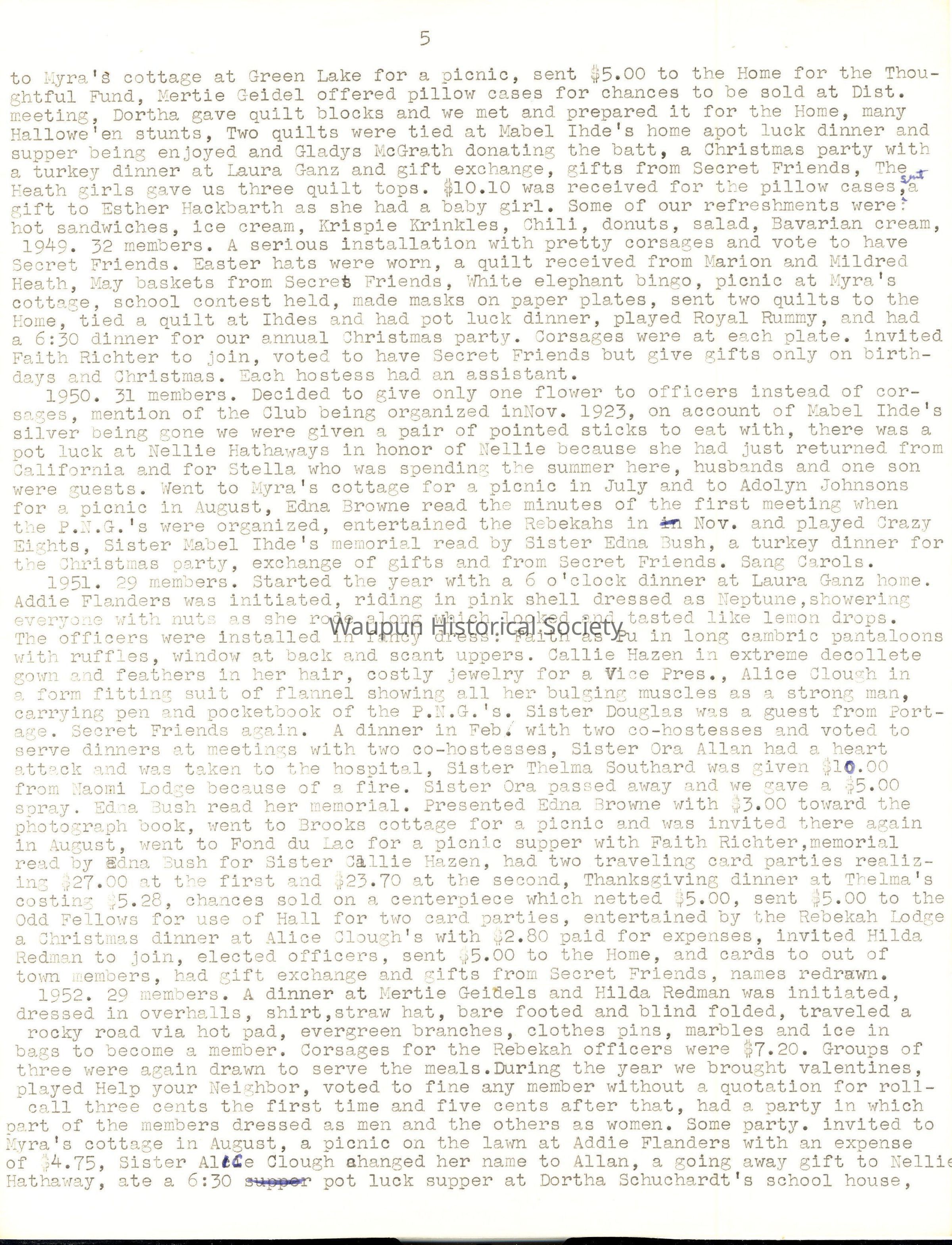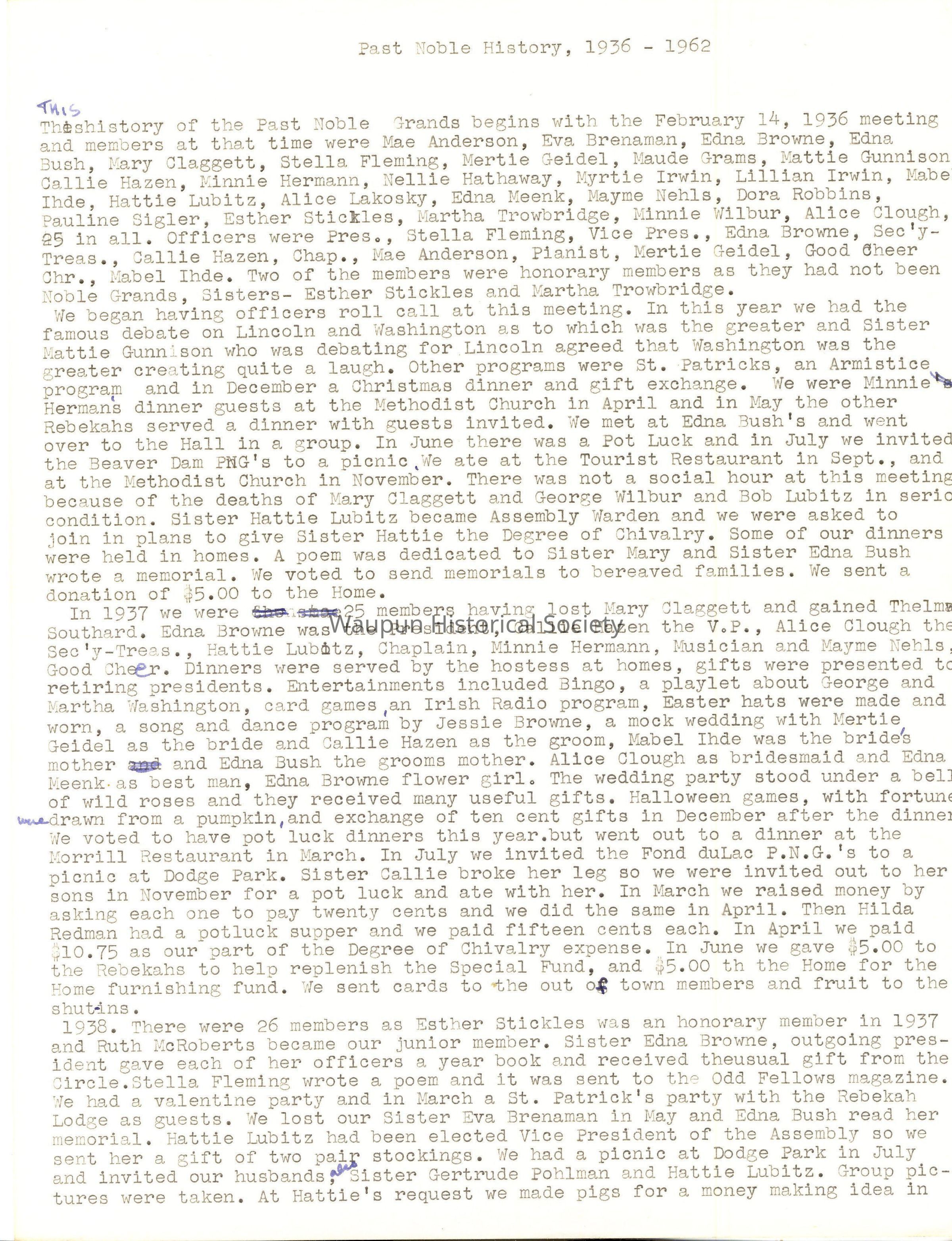 In 1937 we were 25 members having lost Mary Claggett and gained Thelma Southard. Edna Browne was the President, Callie Hazen the V.P., Alice Clough the Sec'y-Tres., Hattie Lubitz, Chaplain, Minnie Hermann, Musician and Mayme Nehls, Good Cheer. Dinners were served by the hostess at homes, gifts were presented to retiring presidents. Entertainments included Bingo, a playlet about George and Martha Washington, card games, an Irish Radio program, Easter hats were made and worn, a song and dance program by Jessie Browne, a mock wedding with Mertie Geidel as the bride and Callie Hazen as the groom, Mabel Ihde was the bride's mother and Edna Bush the grooms mother. Alice Clough as bridesmaid and Edna Meenk.as best man, Edna Browne flower girl. The wedding party stood under a bell of wild roses and they received many useful gifts. Halloween games, with fortunes were drawn from a pumpkin, and exchange of ten cent gifts in December after the dinner We voted to have pot luck dinners this year, but went out to a dinner at the Morrill Restaurant in March. In July we invited the Fond du Lac P.N.G.'s to a picnic at Dodge Park. Sister Callie broke her leg so we were invited out to her sons in November for a pot luck and ate with her. In March we raised money by asking each one to pay twenty cents and we did the same in April. Then Hilda Redman had a potluck supper and we paid fifteen cents each. In April we paid $10.75 as our part of the Degree of Chivalry expense. In June we gave $5.00 to the Rebekahs to help replenish the Special Fund, and $5.00 to the Home for the Home furnishing fund. We sent cards to the out of town members and fruit to the shut-ins.