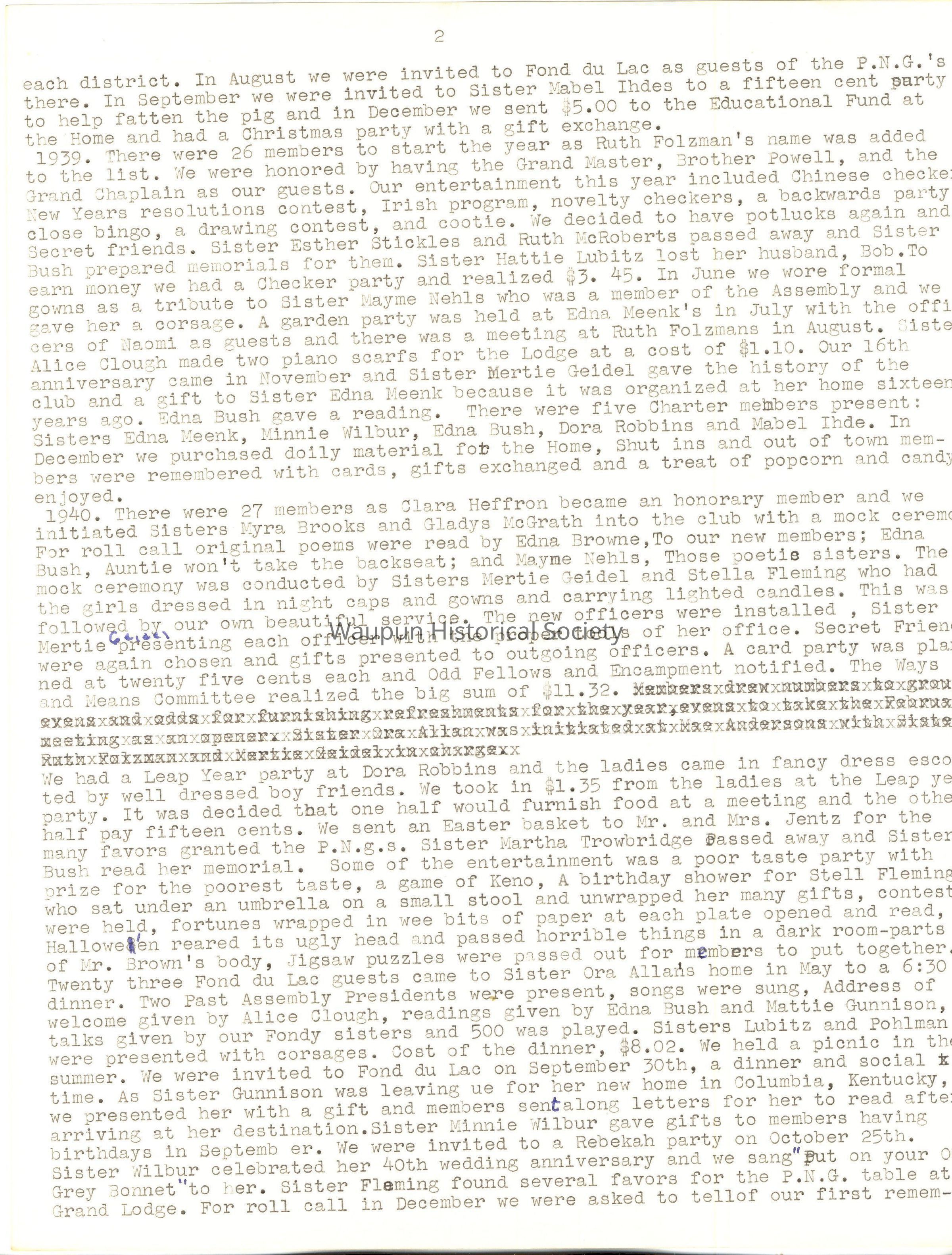 1940. There were 27 members as Clara Heffron became an honorary member and we initiated Sisters Myra Brooks and Gladys McGrath into the club with a mock ceremony. For roll call original poems were read by Edna Browne,To our new members; Edna Bush, Auntie won't take the backseat; and Mayme Nehls, Those poetic sisters. The mock ceremony was conducted by Sisters Mertie Geidel and Stella Fleming who had the girls dressed in night caps and gowns and carrying lighted candles. This was followed by our own beautiful service. The new officers were installed , Sister Mertie Geidel presenting each officer with the proper tools of her office. Secret Friends were again chosen and gifts presented to outgoing officers. A card party was planned at twenty five cents each and Odd Fellows and Encampment notified. The Ways and Means Committee realized the big sum of $11.32. We had a Leap Year party at Dora Robbins and the ladies came in fancy dress escorted by well dressed boy friends. We took in $1.35 from the ladies at the Leap year party. It was decided that one half would furnish food at a meeting and the other half pay fifteen cents. We sent an Easter basket to Mr. and Mrs. Jentz for the many favors granted the P.N.g.s. Sister Martha Trowbridge passed away and Sister Bush read her memorial. Some of the entertainment was a poor taste party with prize for the poorest taste, a game of Keno, A birthday shower for Stell Fleming who sat under an umbrella on a small stool and unwrapped her many gifts, contests were held, fortunes wrapped in wee bits of paper at each plate opened and read, Halloween reared its ugly head and passed horrible things in a dark room- parts of Mr. Brown's body, Jigsaw puzzles were passed out for members to put together. Twenty three Fond du Lac guests came to Sister Ora Allan's home in May to a 6:30
