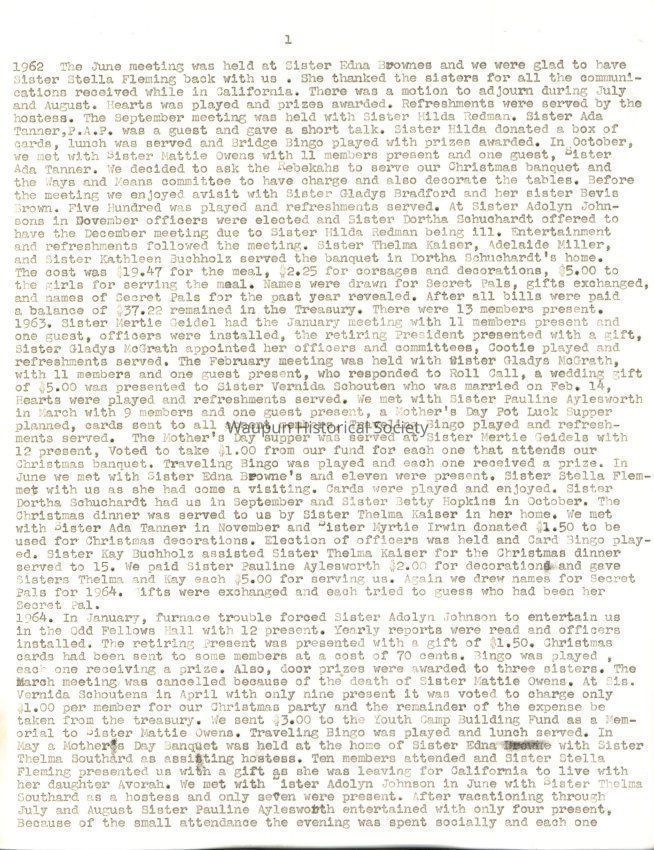 This history of the Past Noble Grands begins with the February 14, 1936 meeting and members at that time were Mae Anderson, Eva Brenaman, Edna Browne, Edna Bush, Mary Claggett, Stella Fleming, Mertie Geidel, Maude Grams, Mattie Gunnison, Callie Hazen, Minnie Hermann, Nellie Hathaway, Myrtle Irwin, Lillian Irwin, Mabel Ihde, Hattie Lubitz, Alice Lakosky, Edna Meenk, Mayme Nehls, Dora Robbins, Pauline Sigler, Esther Stickles, Martha Trowbridge, Minnie Wilbur, Alice Clough, 25 in all. Officers were Pres., Stella Fleming, Vice Pres., Edna Browne, Sec'yTreas., Callie Hazen, Chap., Mae Anderson, Pianist, Mertie Geidel, Good Cheer Chr., Mabel Ihde. Two of the members were honorary members as they had not been Noble Grands, Sisters- Esther Stickles and Martha Trowbridge.