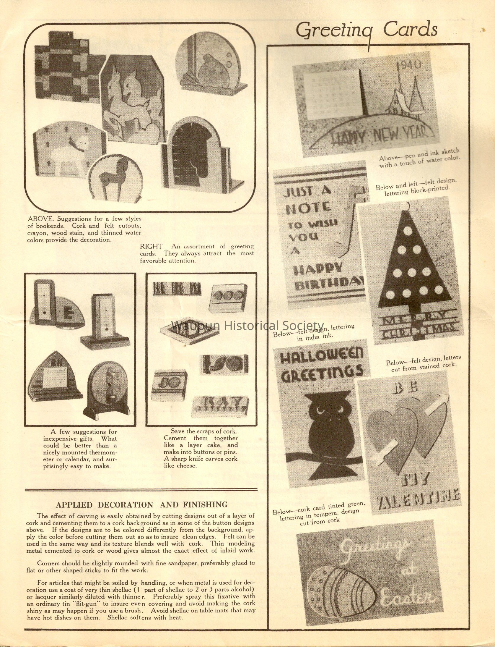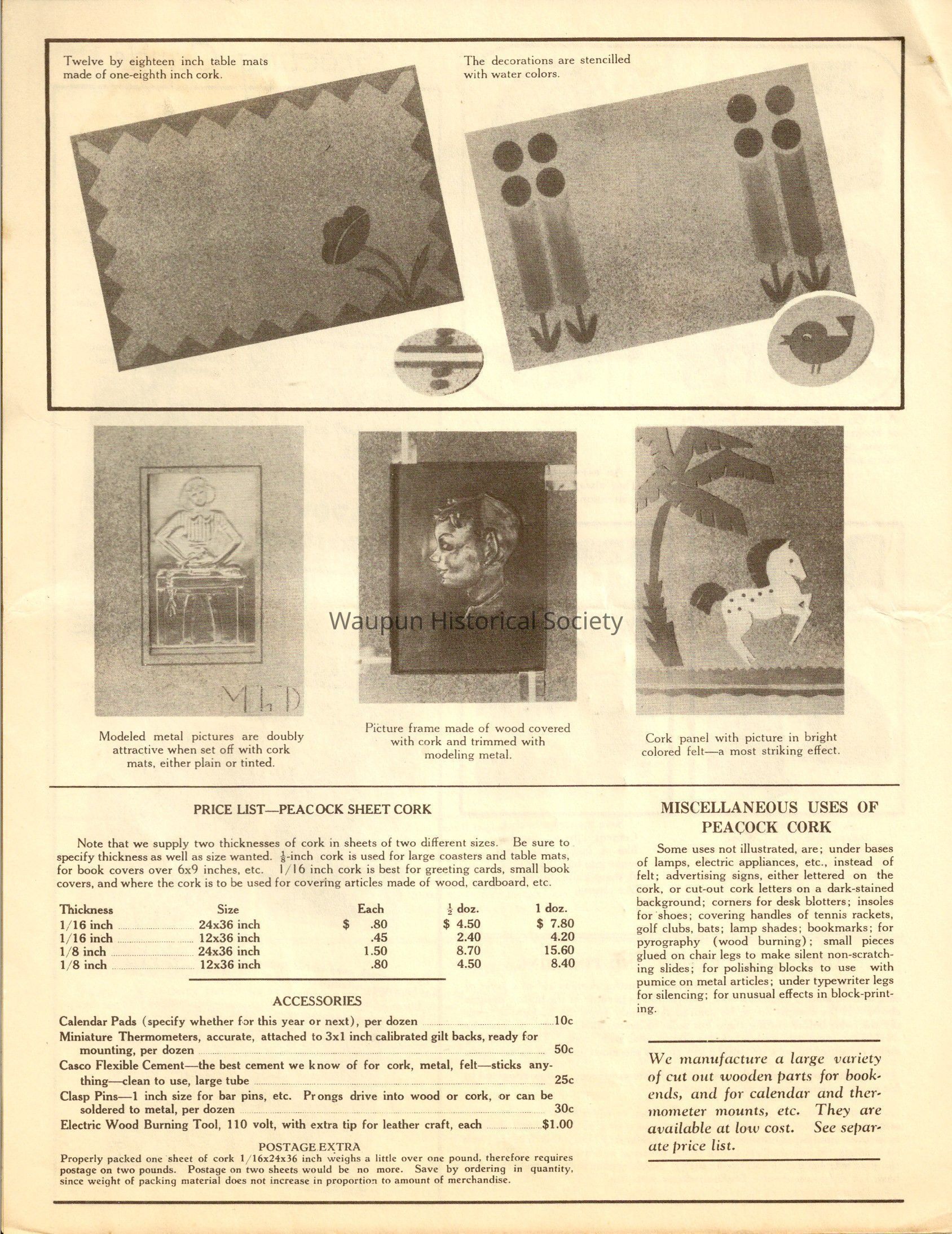 The Handcrafters, Peacock Cork Craft booklet showcases the cork, projects and instructions for use. Included is direction for cutting and carving, coloring, cementing, applied decoration and finishing. A price list for sheet cork, suggested accessories, postage requirements and additional uses for Peacock cork are featured on the back page.Acquisition
