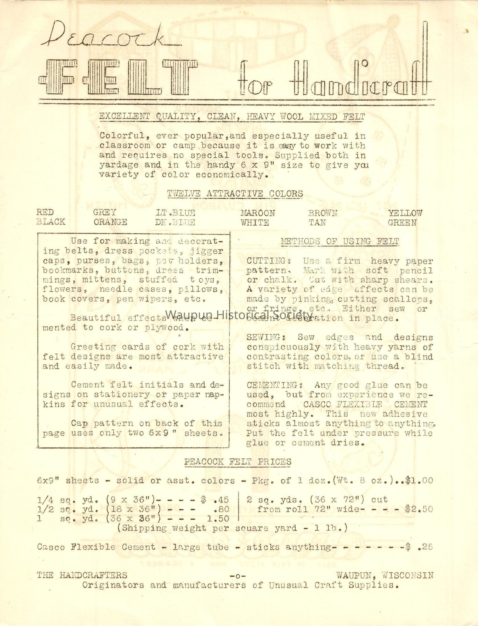 Peacock Wool felt mix is available in twelve colors. The ad includes methods of using felt and suggested uses. Prices and sizes of felt pieces and suggested purchase of Casco Flexible Cement are also included on this page.