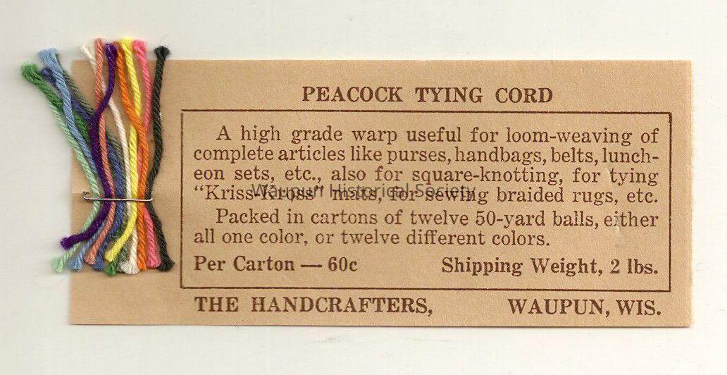 Peacock tying cord samples are attached to a 2" X 41/2" card for advertising/ product promoting for The Handcrafters of Waupun, Wis. The card indicates uses for the cord, the twelve colors available and how it is packed.Acquisition