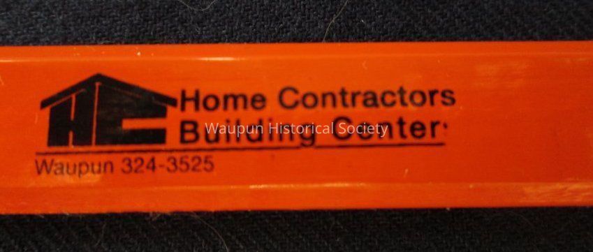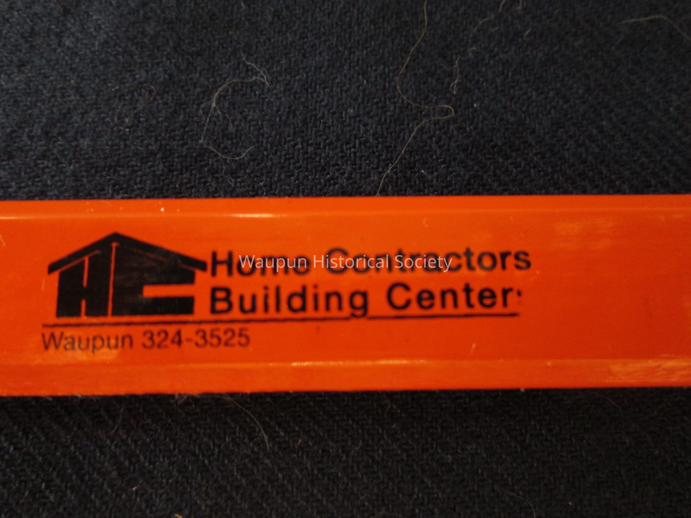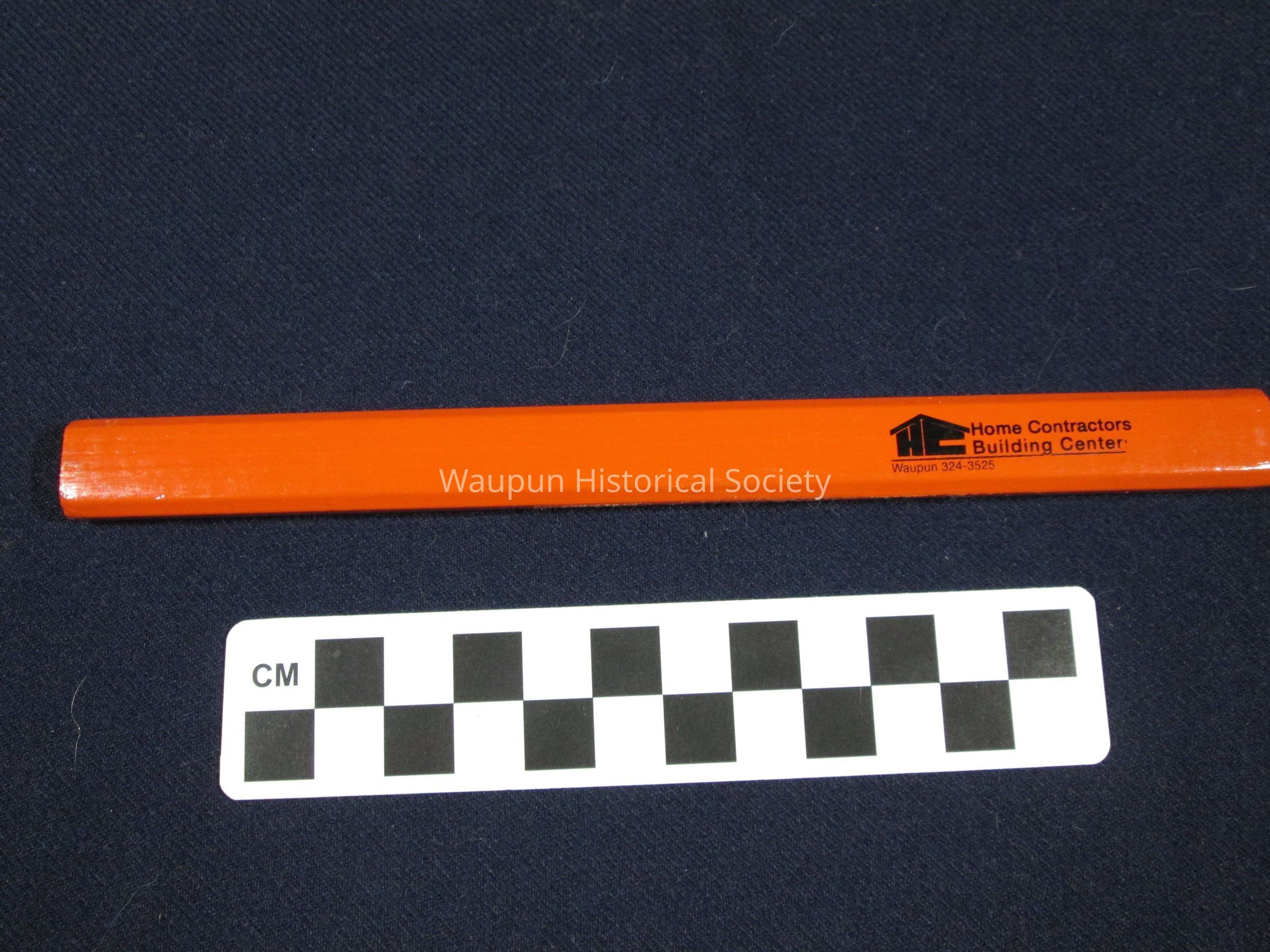 Carpenter's pencil advertising Home Contractors Building Center, Waupun, 324-3525. It is orange and rectangular - 7" long, 1/2" in width.Acquisition