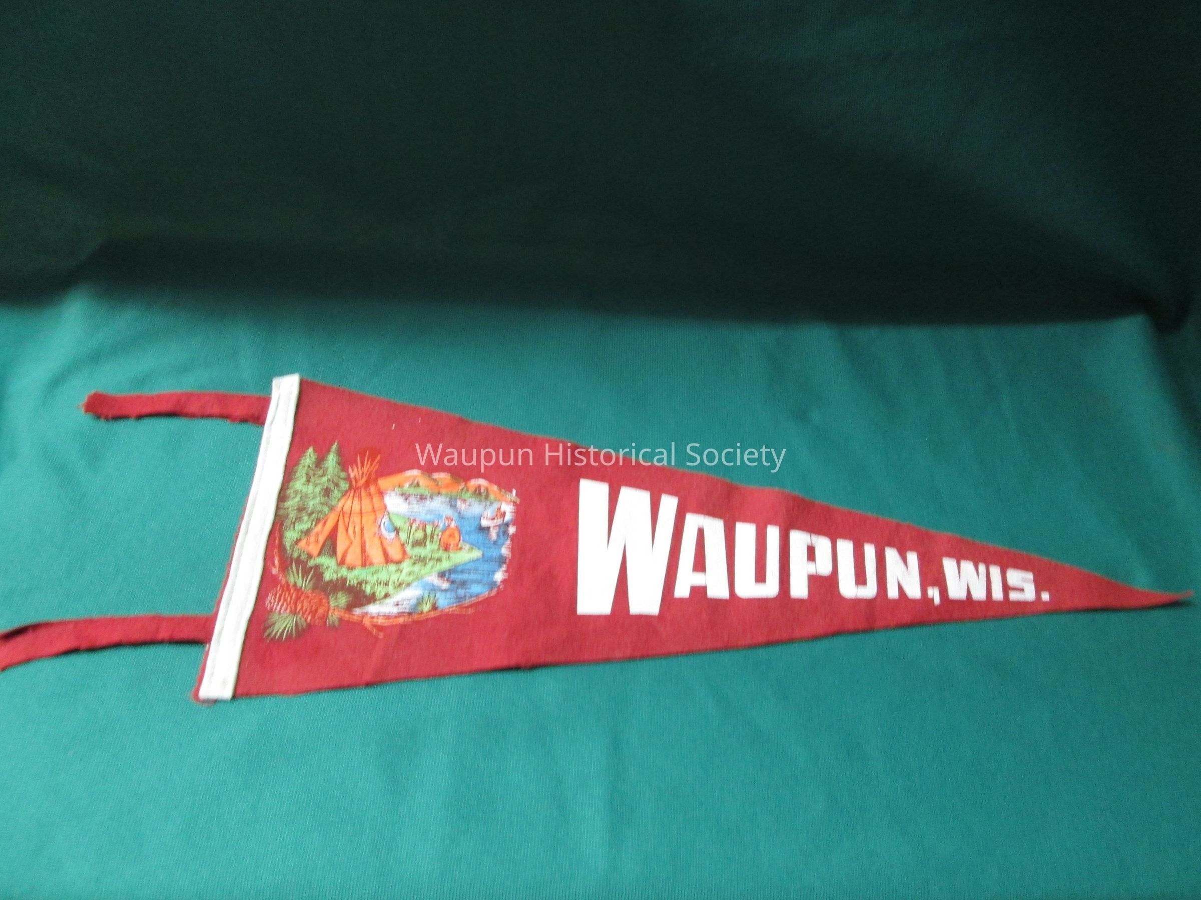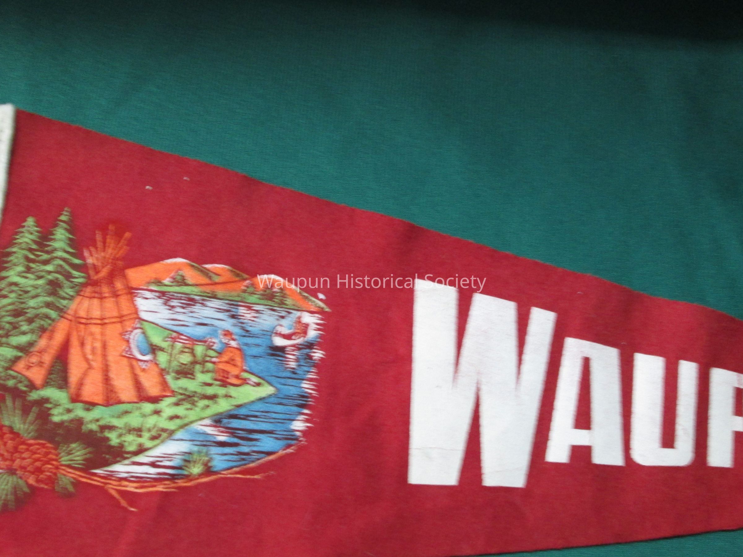 Pennant of Waupun Wis. 15 inch long and 4 inch wide red in color with white writing says Waupun, Wis. with a picture of a indian village on it.Acquisition