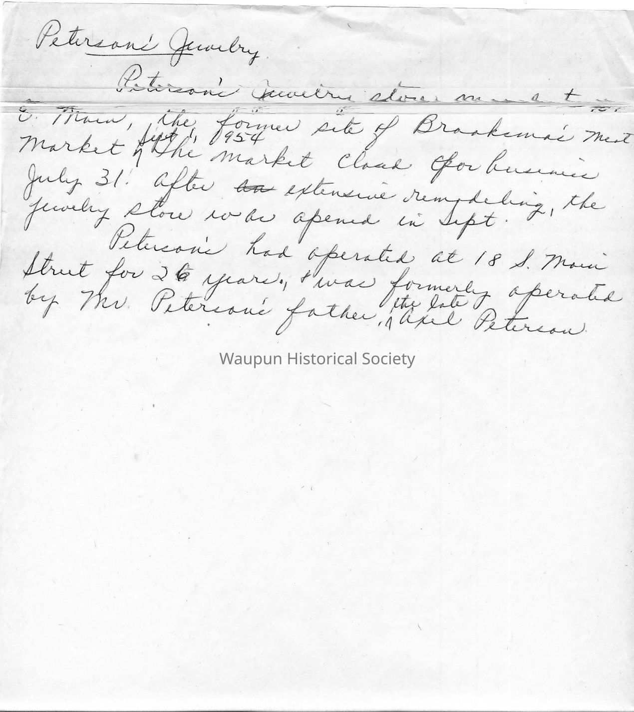 Historical information on Peterson's Jewelry for 1976 Bicentennial Celebration in Waupun, WI.