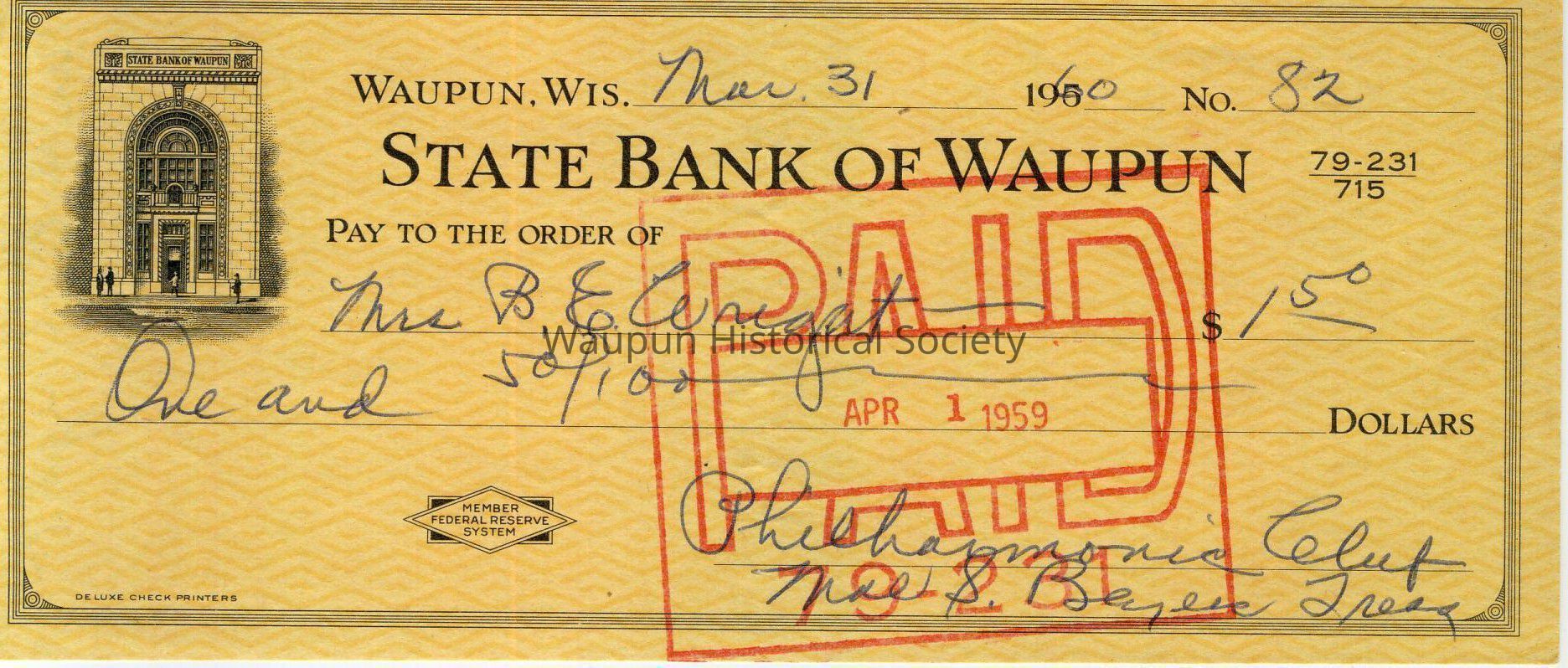 Canceled check drawn on State Bank of Waupun, dated Waupun, Wisconsin March 31, 1960. This is check #82, written out to and endorsed by Mrs. B. E. Wright. Check is signed by "Philharmonic Club, Mae S. Beyers Treas." Interestingly, the PAID stamp on the front is dated April 1, 1959.Acquisition