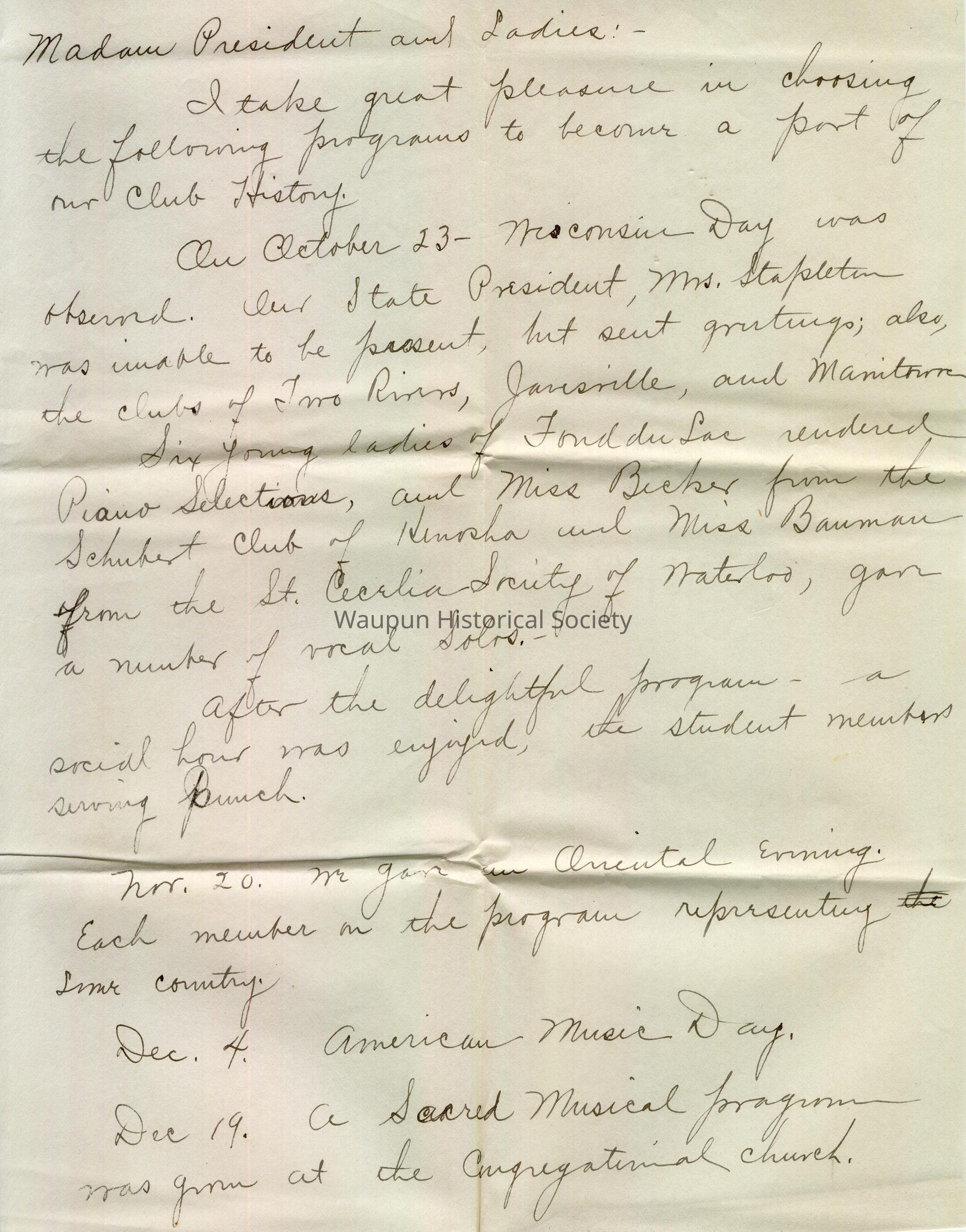 Philharmonic Music Club of Waupun, Wisconsin, Historian's Report, April 9, 1917.