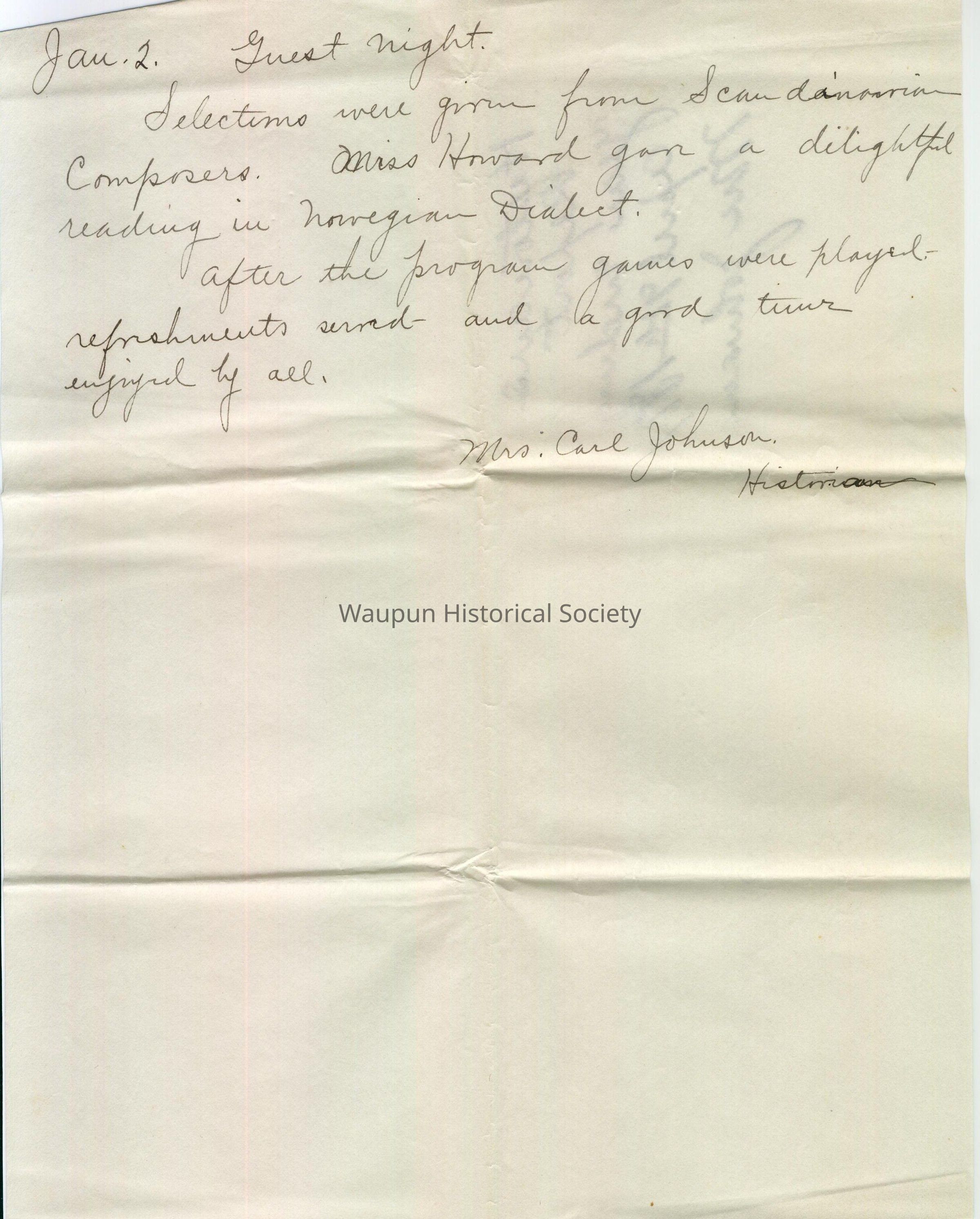 Jan. 2--Guest night. Selections were given from Scandanavian composers. Miss Howard gave a delightful reading in Norwegian dialect.