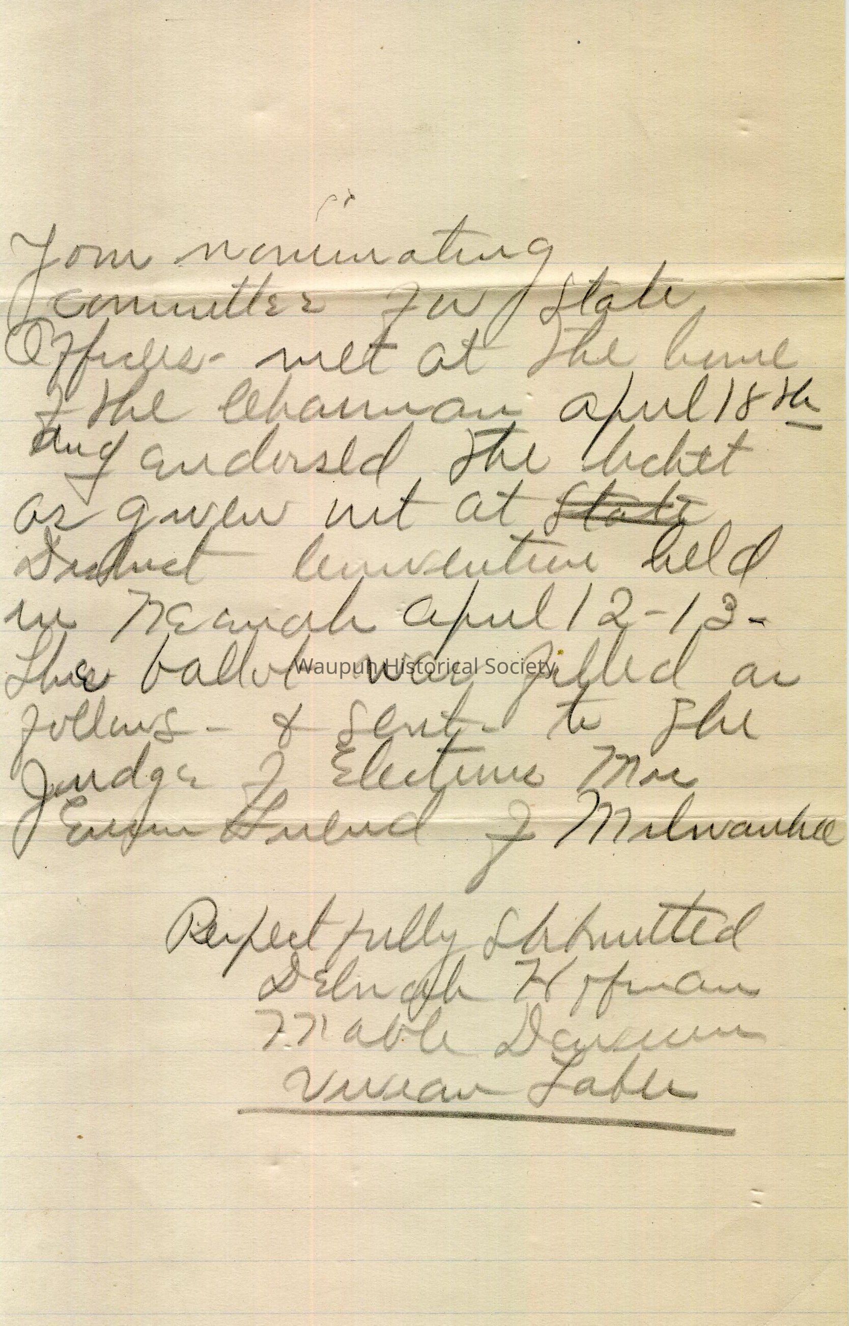 Your nominating committee for State Officers met at the home of the chairman April 18th and endorced the ticket as given at [unreadable] Convention held in Neenah April 12-13. The ballet was filled as follows and sent to the Judge of Elections Mrs. Eunice Luend of Milwaukee.