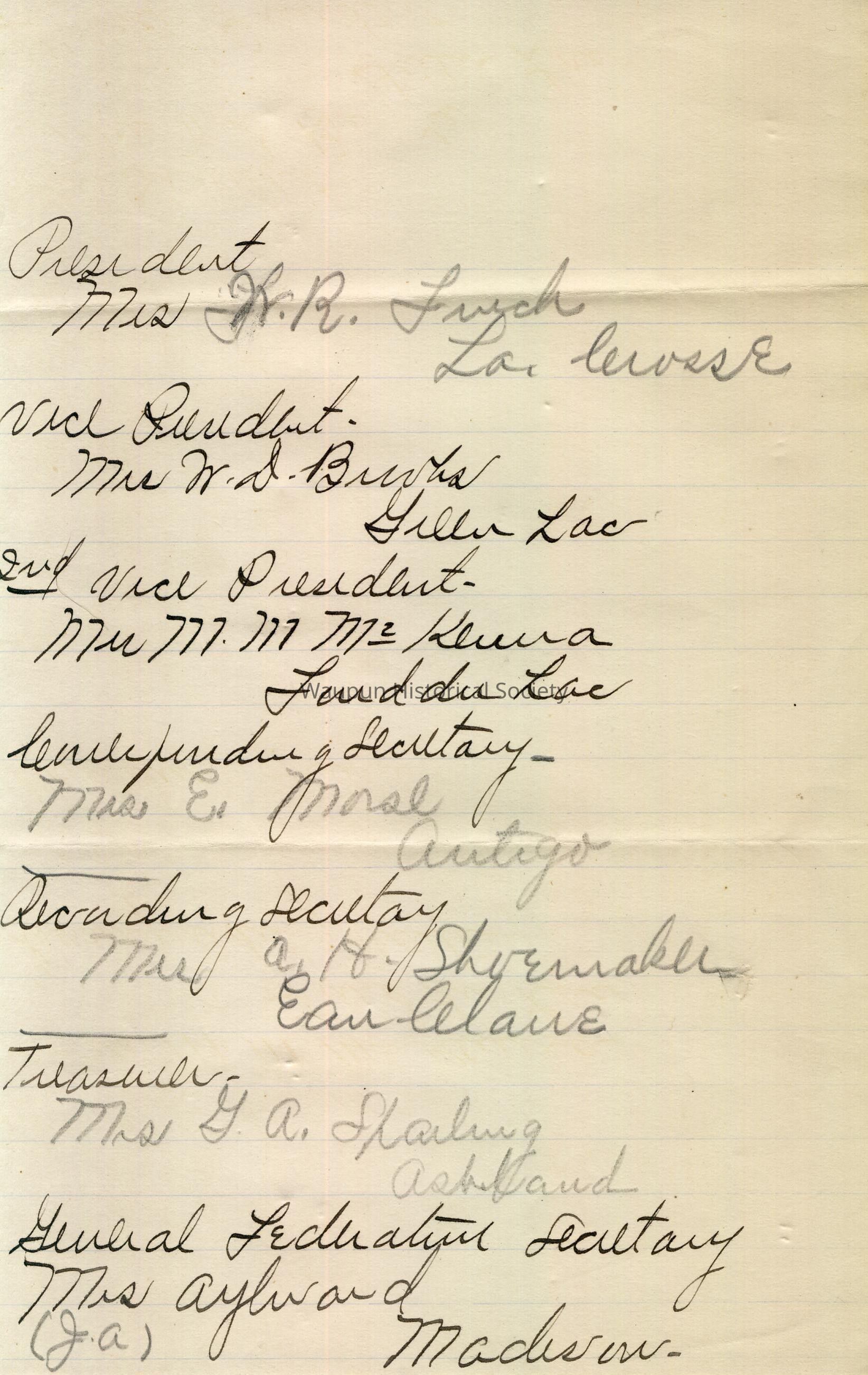 Recording Secretary: Mrs. A. H. Shoemaker, Eau Claire