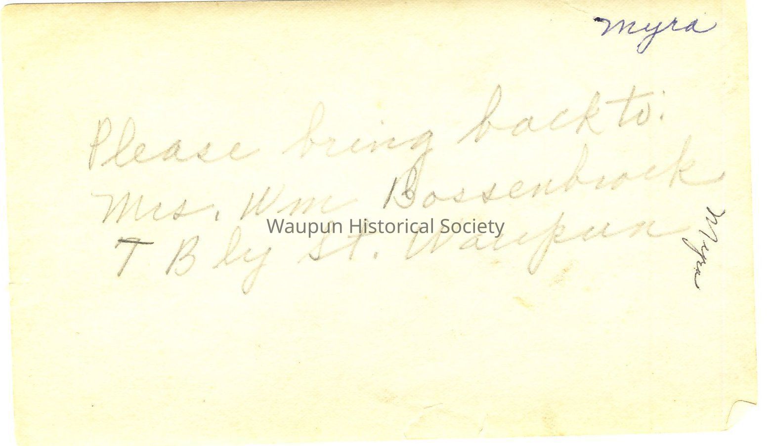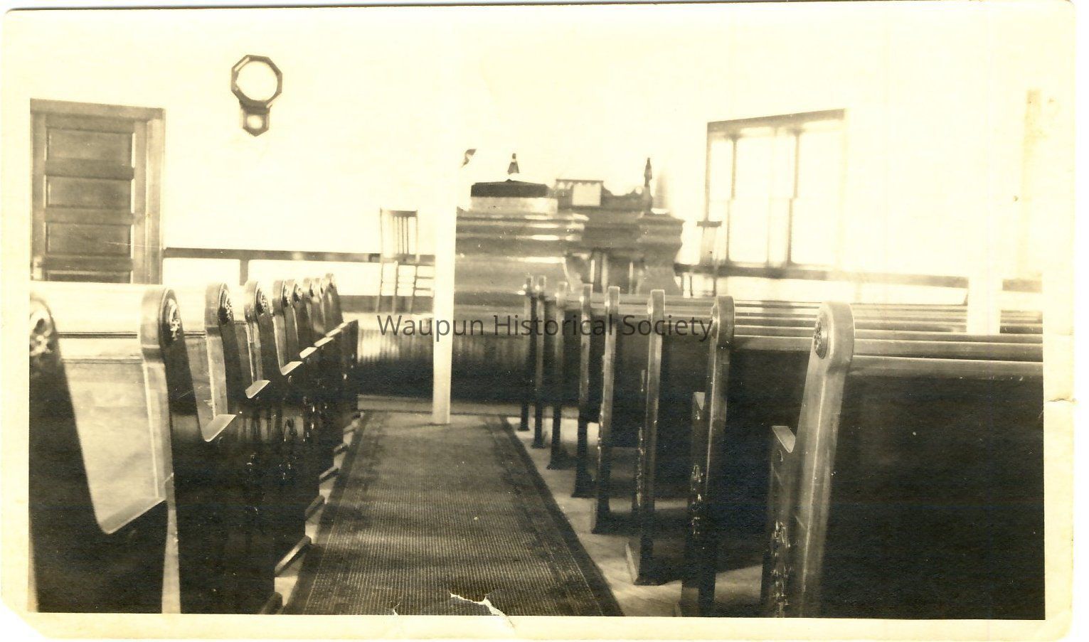 Black and white photo of inside of the First Christian Reformed Church of Waupun given by Mrs. Wm. Bossenbroek, 7 Bly St., Waupun, Wis. The name Myra is written on back of photo, also. This photo was attached to the historical information on The First Christian Reformed Church of Waupun for the 1976 Bicentennial Celebration in Waupun.Acquisition