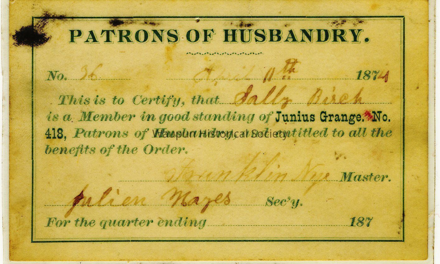 Membership Card, Patrons of Husbandry, Grange #418, Sally Birch, 1874Entry/Object ID