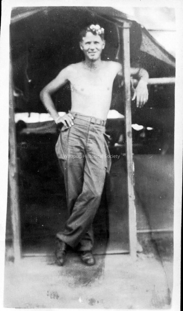 Mr. Walter Riel was a Sergeant with the 38th Photo Reconnaissance Squadron, 13th Air Force from 1942-1946. The Riel Collection is a series of photos that were collected by Mr. Riel during this time. This tent was typical of the tents troop lived in. At first they only had pup tents to live in. As time went on, they were able to add things to the tents. The name of the man in the photo is unknown.Acquisition
