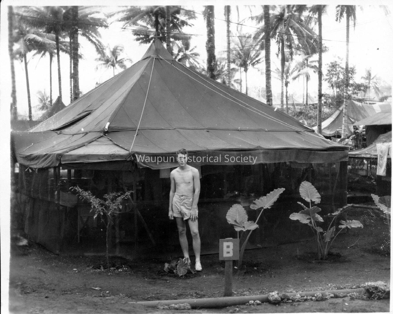 The coconut trees in the background were planted by the Dutch. The soldiers tents eventually had electricity after the Japanese were driven back. This was near the end of WarII on the island of Moratai. The man is unkown.Acquisition
