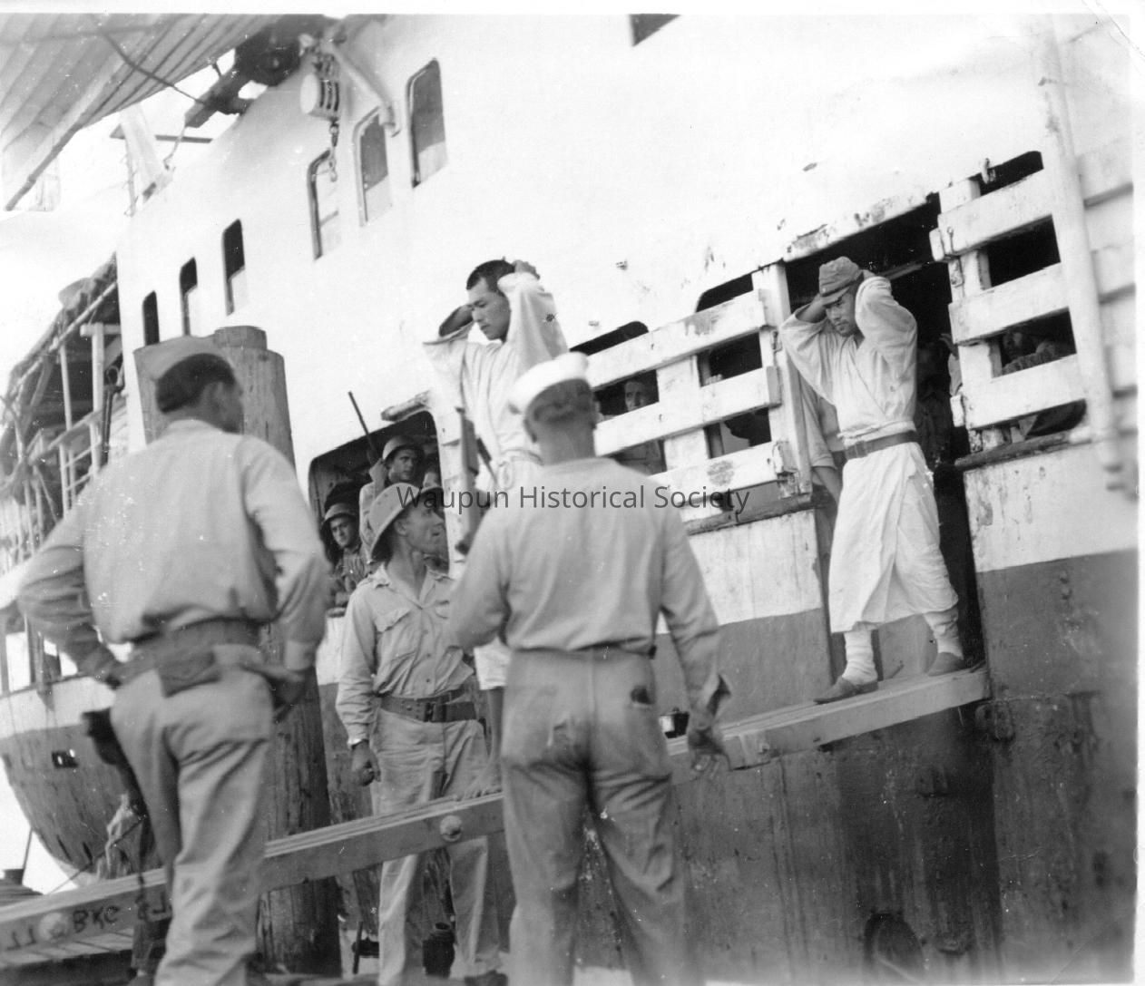 This photo shows the Japanese soldiers coming off the captured Japanese ship described in photo 2001.0019.0024Acquisition