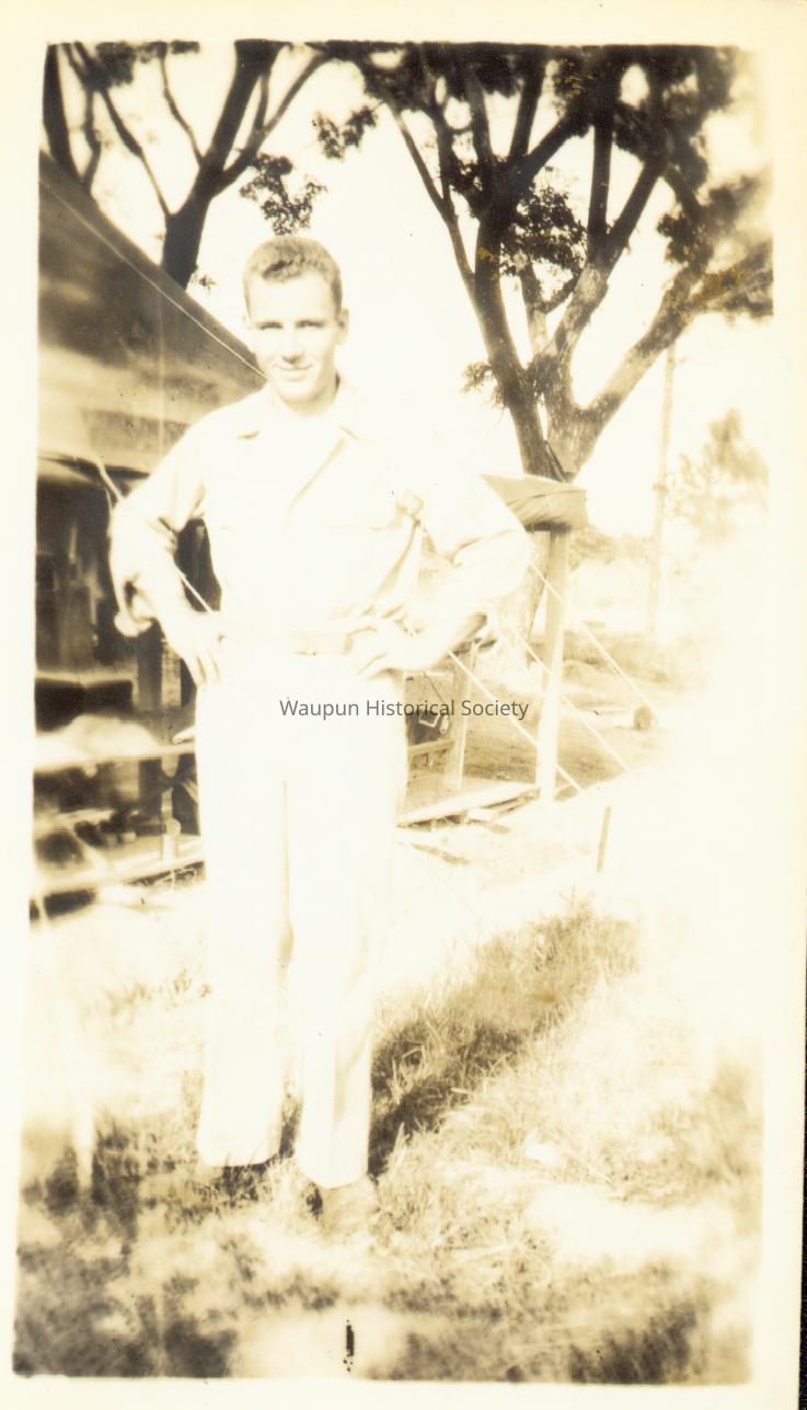 Mr. Walter Riel was a Sergeant with the 38th Photo Reconnaissance Squadron, 13th Air Force from 1942-1946. The Riel Collection is a series of photos that were collected by Mr. Riel during this time. This is a picture of Walter in front of a tent on Moratai. The island was Dutch and they had Dutch money. This was the summer of 1945 in the Dutch East Indies. There were no towns on the island.Acquisition