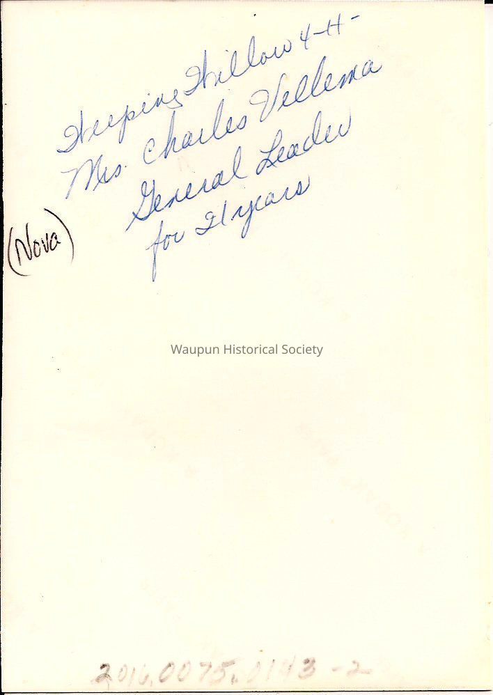 Color photo of Mrs. Charles Vellema (Nova) who was the first general leader of the Weeping Willow Club for 21 years. There is no date indicated on the photo. This photo was included with the paperwork compiled for the historical information on the Weeping Willow Club for the Waupun 1976 Bicentennial Celebration.Acquisition