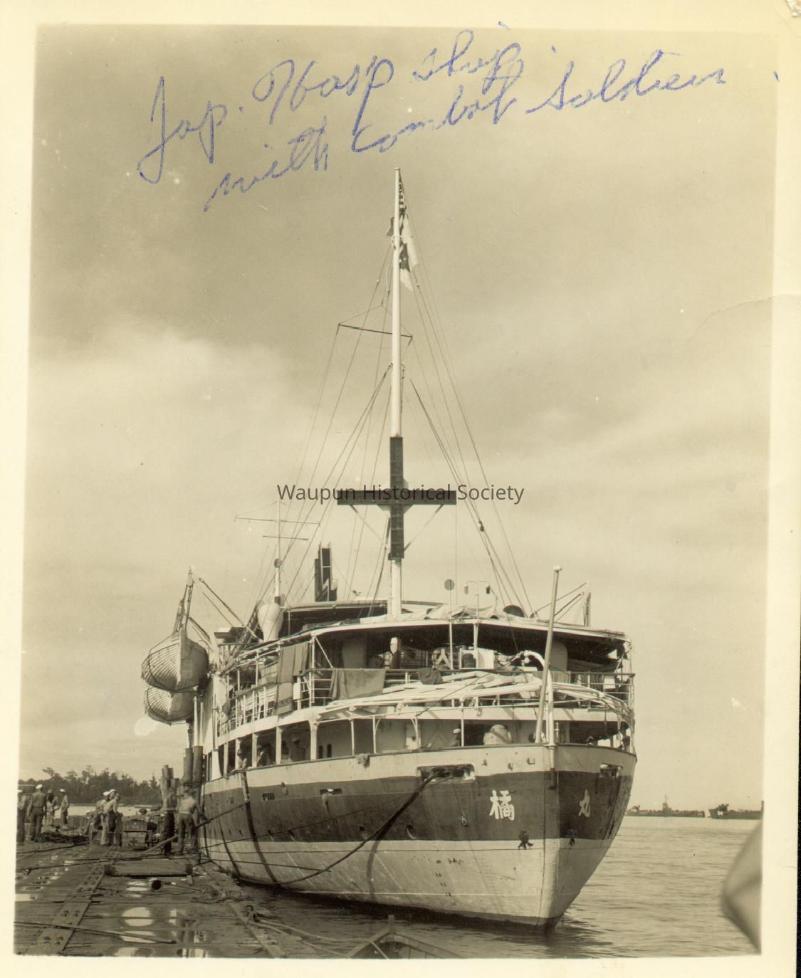 This photo is of a Japanese ship with hospital markings. The ship was captured, taken to port at Moratai Island. The ship was carrying Japanese soldiers and ammunition. There were no injured on board.Acquisition