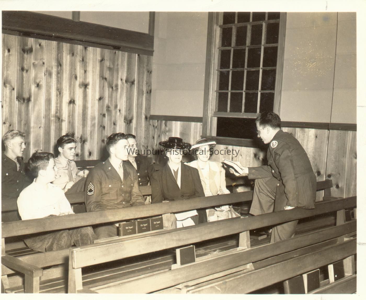 Mr. Walter Riel was a Sergeant with the 38th Photo Reconnaissance Squadron, 13th Air Force from 1942-1946. The Riel Collection is a series of photos that were given to the Waupun Historical Society by Mr. Riel. This photo shows the Bible Study group at Will Rogers Field, Oklahoma.Acquisition