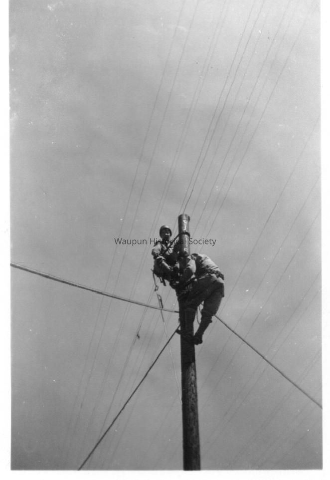 Mr. Walter Riel was a Sergeant with the 38th Photo Reconnaissance Squadron, 13th Air Force from 1942-1946. The Riel Collection is a series of photos that were given to the Waupun Historical Society by Mr. Riel. This photo shows training to be telephone linesman at Camp Crowder, MOAcquisition