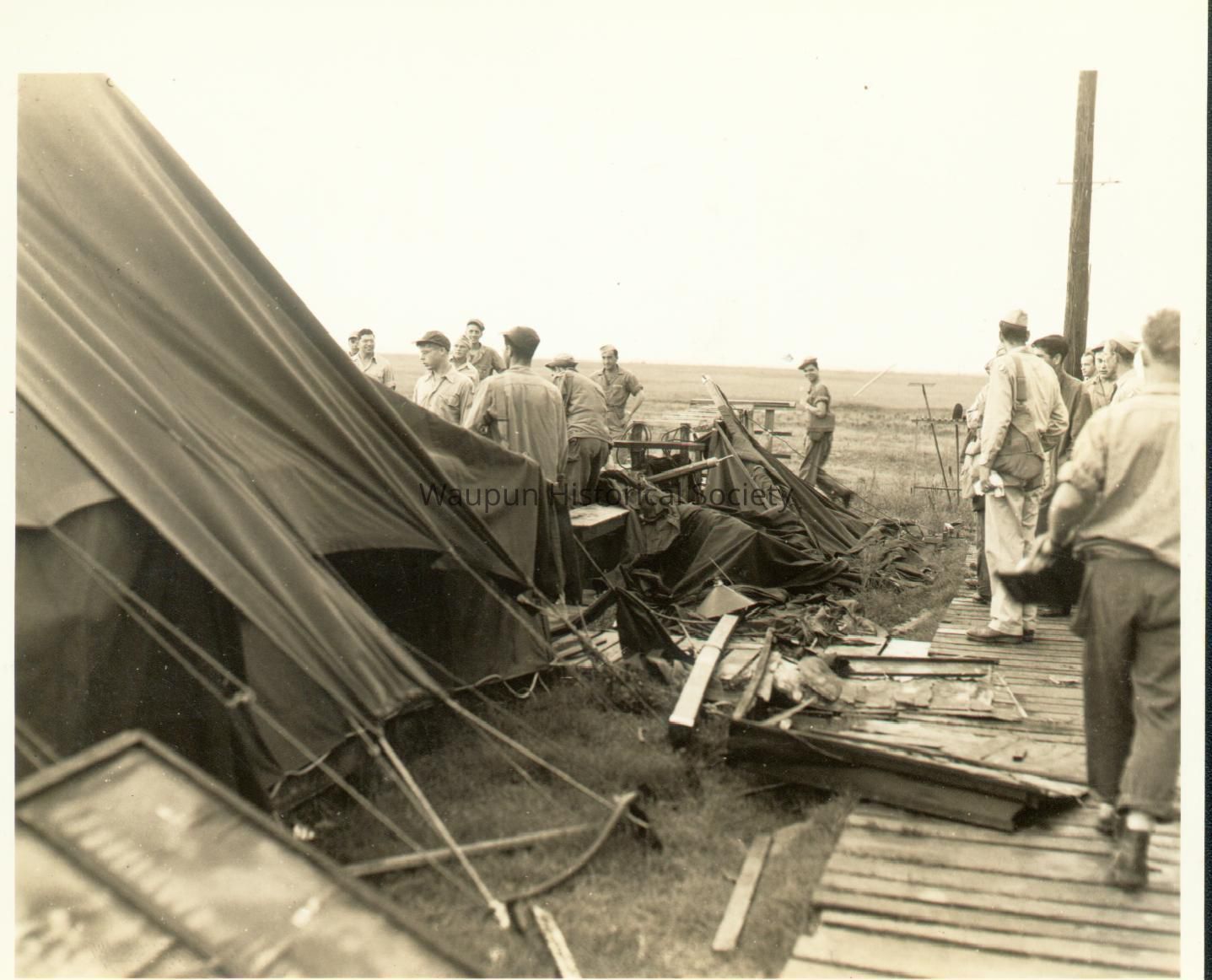 Mr. Walter Riel was a Sergeant with the 38th Photo Reconnaissance Squadron, 13th Air Force from 1942-1946. The Riel Collection is a series of photos that were given to the Waupun Historical Society by Mr. Riel. This photo shows the aftermath of a storm at Muskogee AFB.Acquisition