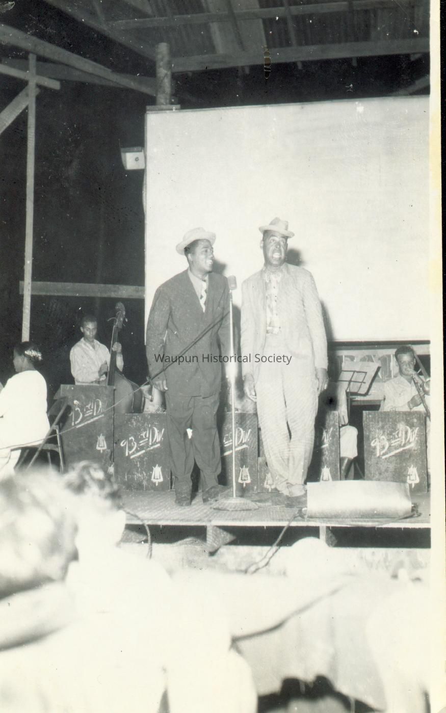 Mr. Walter Riel was a Sergeant with the 38th Photo Reconnaissance Squadron, 13th Air Force from 1942-1946. The Riel Collection is a series of photos that were given to the Waupun Historical Society by Mr. Riel. This photo shows a USO Show on Moratai.Acquisition
