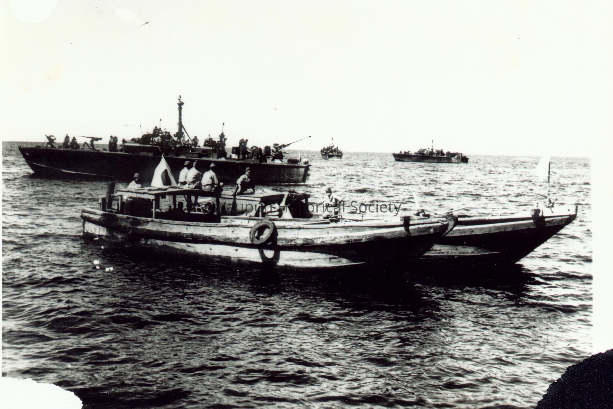 Mr. Walter Riel was a Sergeant with the 38th Photo Reconnaissance Squadron, 13th Air Force from 1942-1946. The Riel Collection is a series of photos that were given to the Waupun Historical Society by Mr. Riel. This photo shows the Japanese surrender delagation to the Halmahara Island.Acquisition