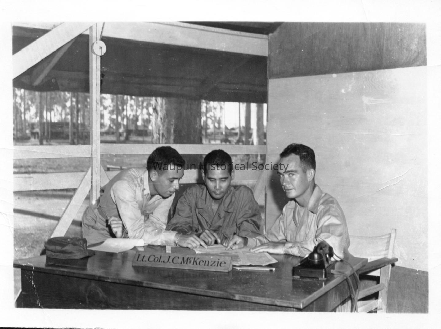 Photograph, Three Men in Office. The Sign Desk says Lt. Col. J. C. McKenzieEntry/Object ID